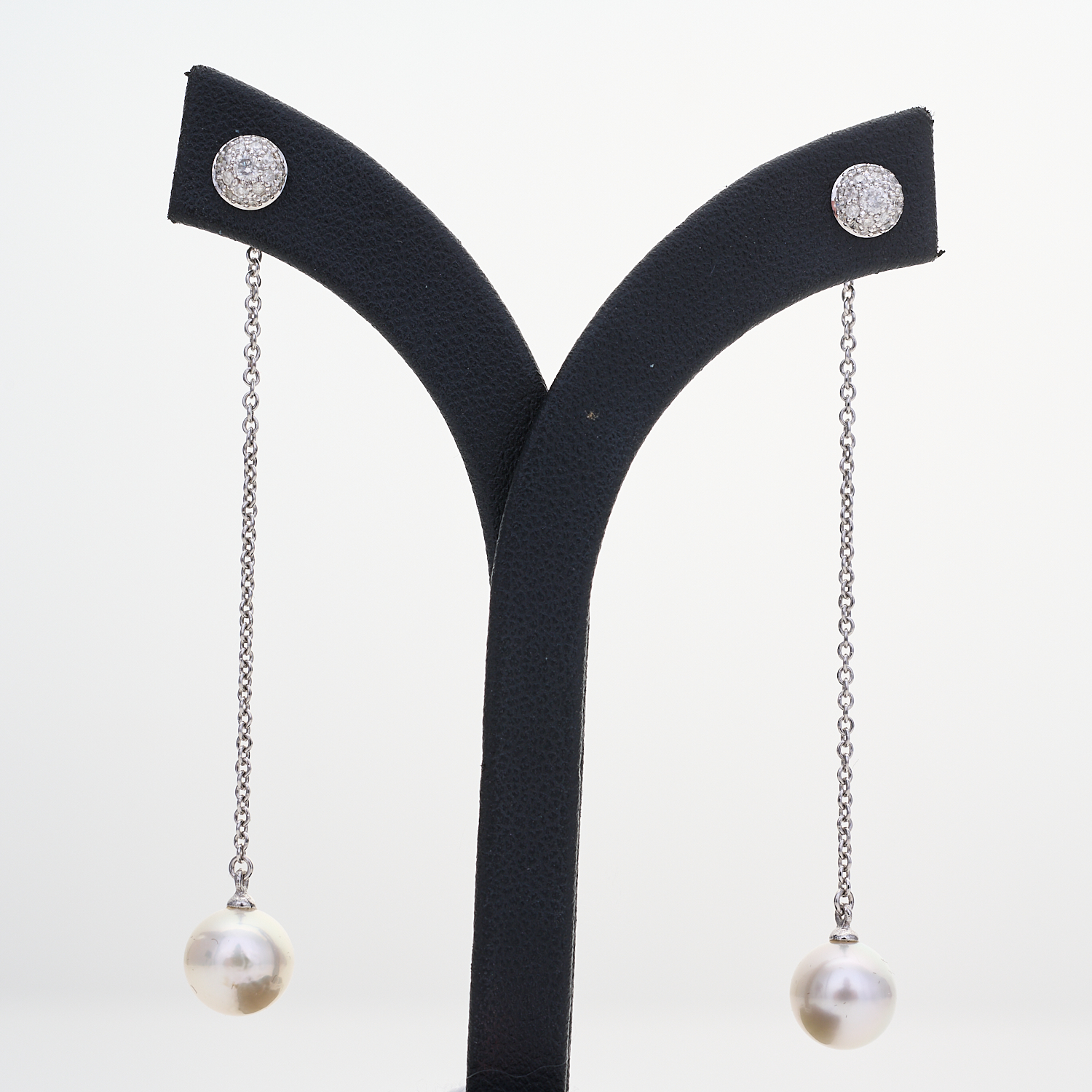 A PAIR OF DIAMOND AND SOUTH SEA PEARL SET DROP EARRINGS IN STERLING SILVER, LENGTH 66MM