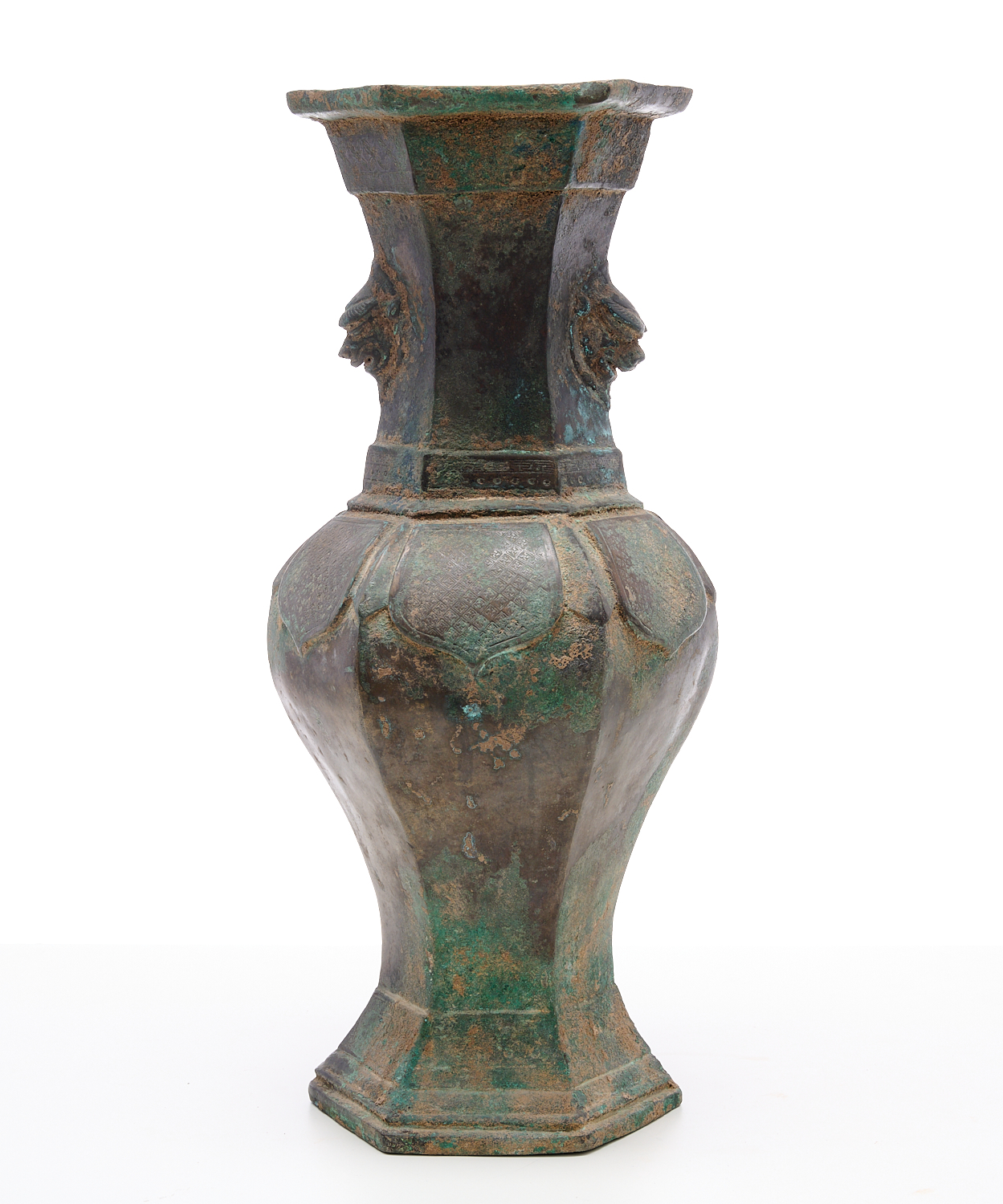 Of hexagonal section baluster form, with incised geometric decoration and lion mask handles.