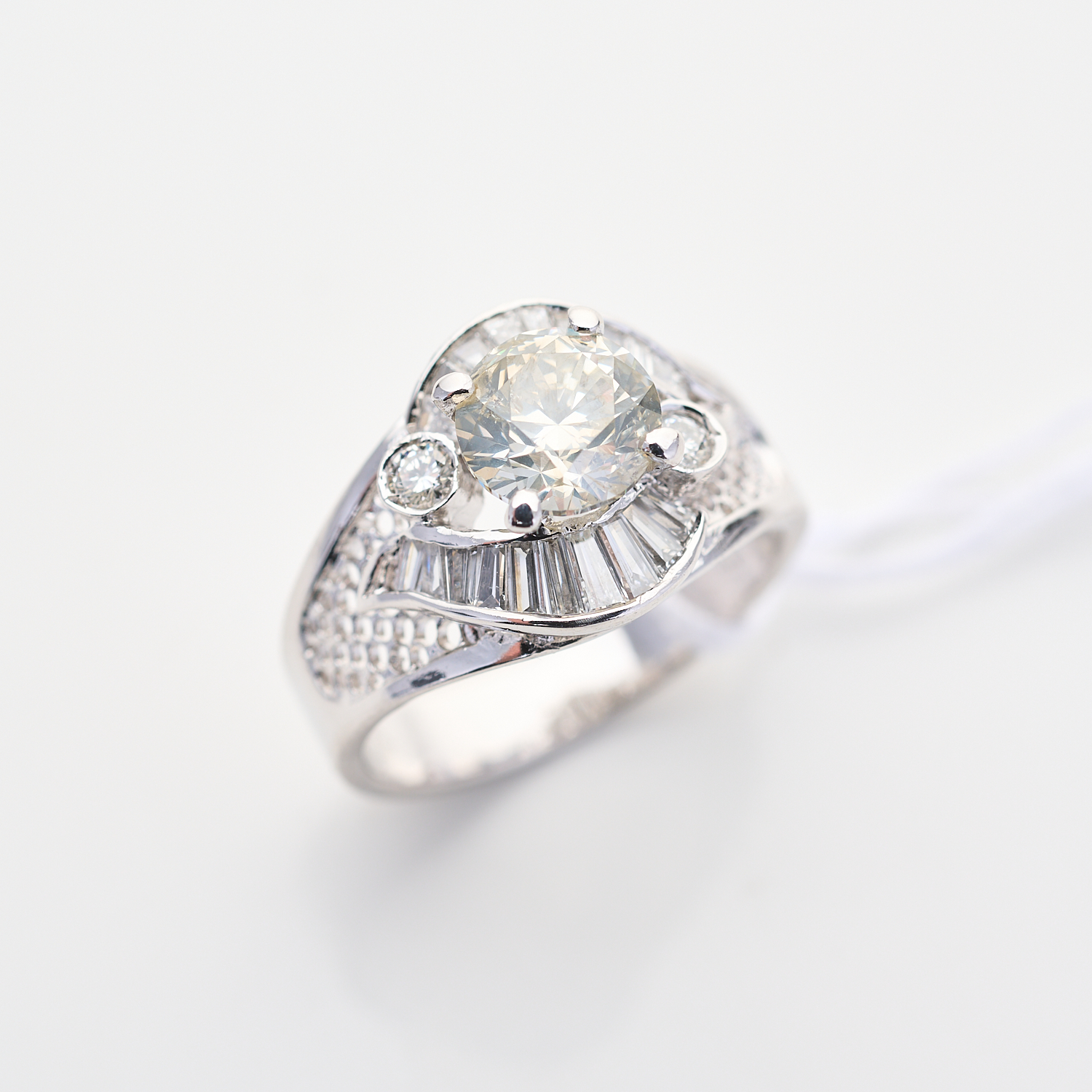 A DIAMOND SET RING IN 18CT WHITE GOLD, THE CENTRAL DIAMOND WEIGHING 1.30CTS, THE SURROUNDING DIAMONDS WEIGHING 0.90CTS, SIZE L