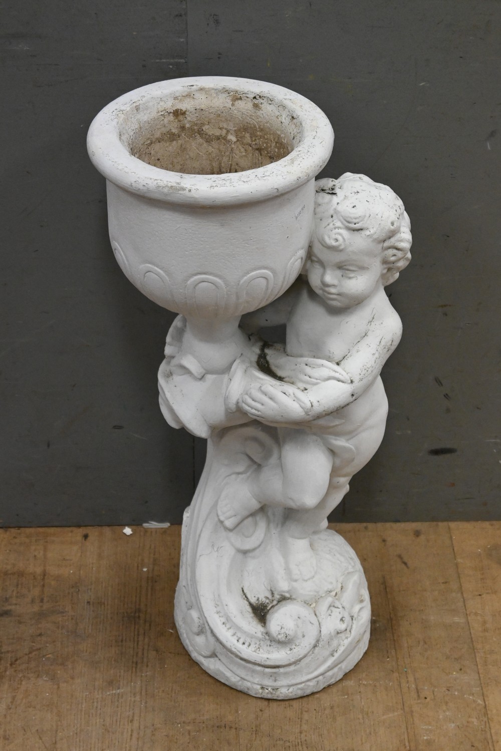 A FRENCH RECONSTITUTED GARDEN STATUE POT WITH CHERUB DECORATION ON FLUTED BASE (A/F) (75H CM) (PLEASE NOTE THIS HEAVY ITEM MUST BE REMOVED BY CARRIERS AT THE CUSTOMER'S EXPENSE. LEONARD JOEL STAFF CANNOT ASSIST CARRYING THIS ITEM) (X-LARGE ITEM)
