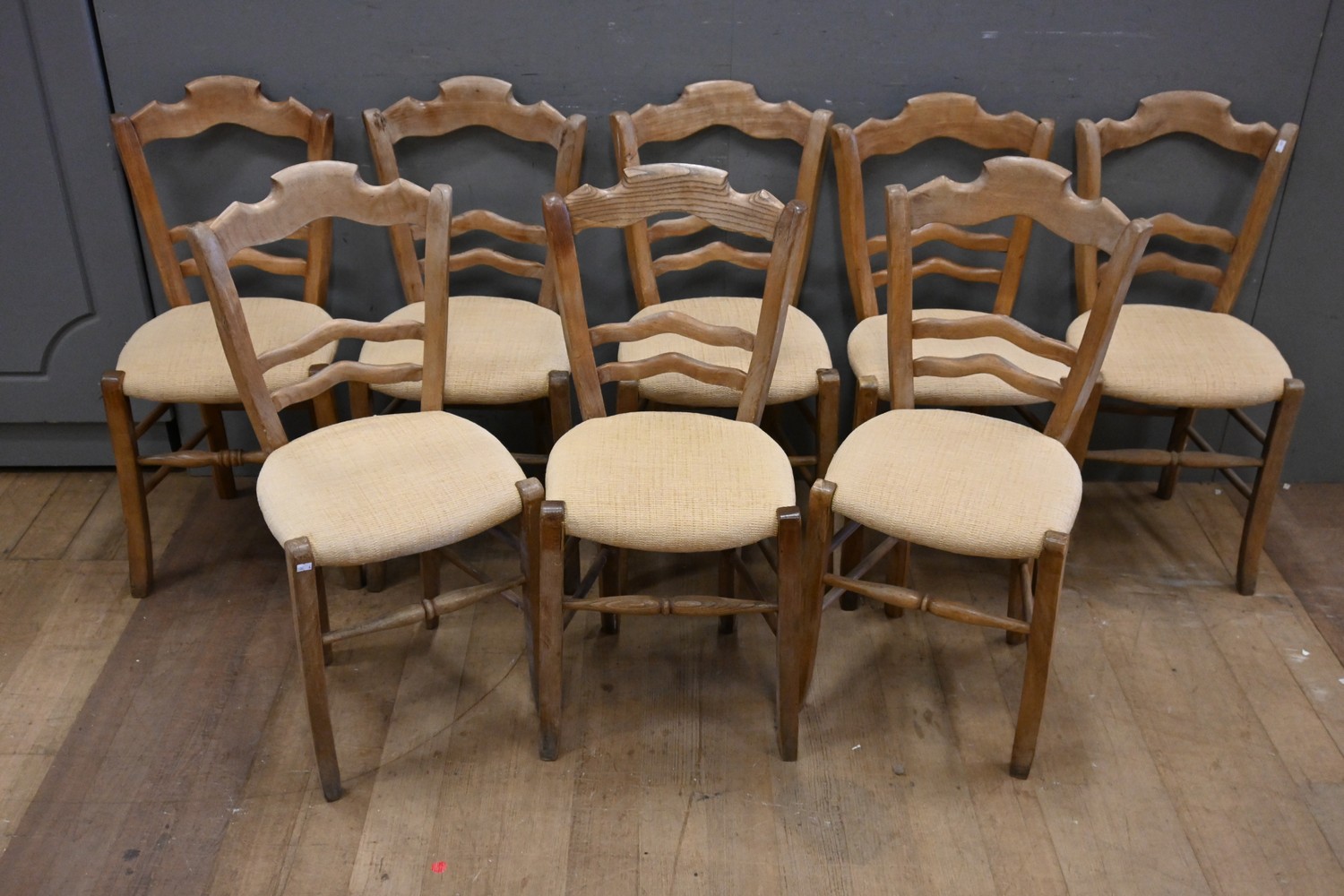 A SET OF EIGHT FRENCH DINING CHAIRS (A/F) (88H x 43W x 40D CM) (LEONARD JOEL DELIVERY SIZE: LARGE)