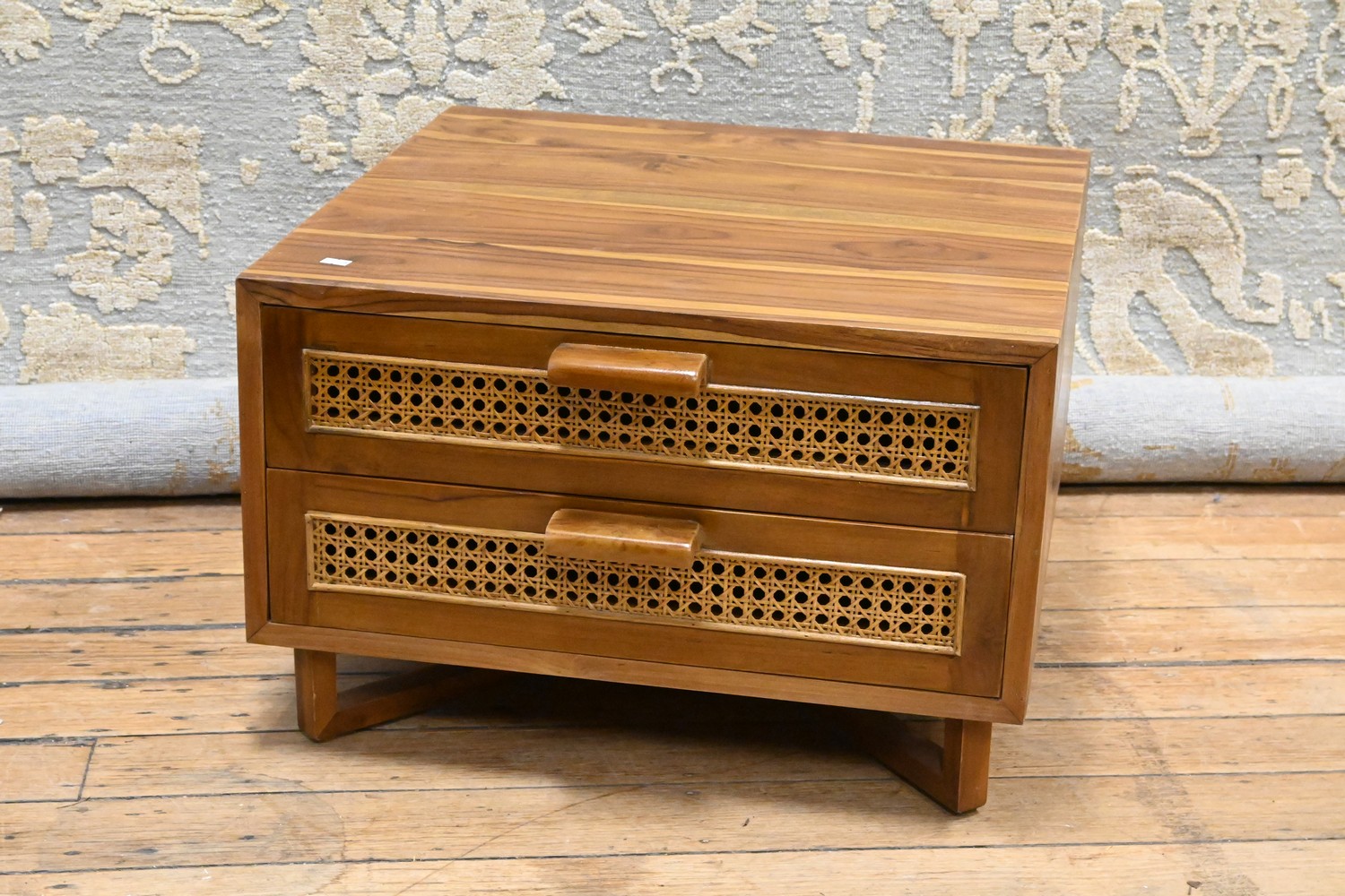 A TEAK COFFEE TABLE WITH RATTAN DRAWER (H40 X W61 X D65 CM) (LEONARD JOEL DELIVERY SIZE: LARGE)