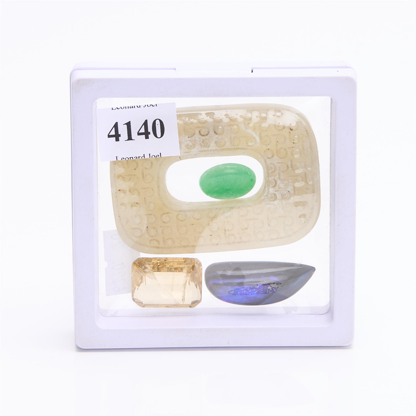 A COLLECTION OF FOUR GEMSTONES INCLUDING WHITE JADE, OPAL, CITRINE AND GREEN JADE, LEONARD JOEL LOCAL DELIVERY SIZE: SMALL
