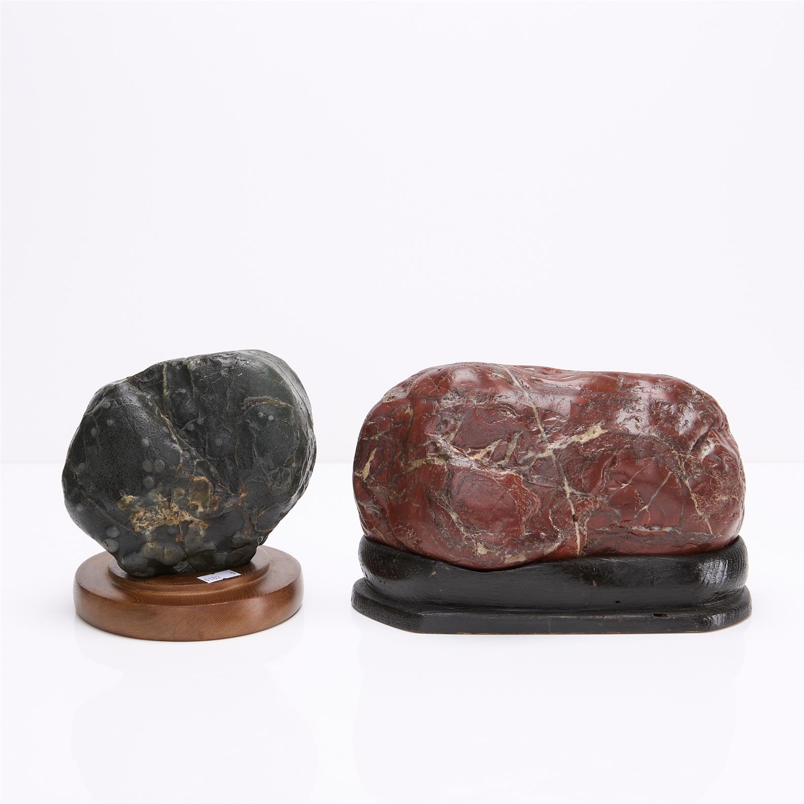 TWO HARDSTONE SCHOLARS ROCKS ON WOODEN BASES - BASES WITH CALLIGRAPHY TO UNDERSIDE W.21CM, LEONARD JOEL LOCAL DELIVERY SIZE: MEDIUM