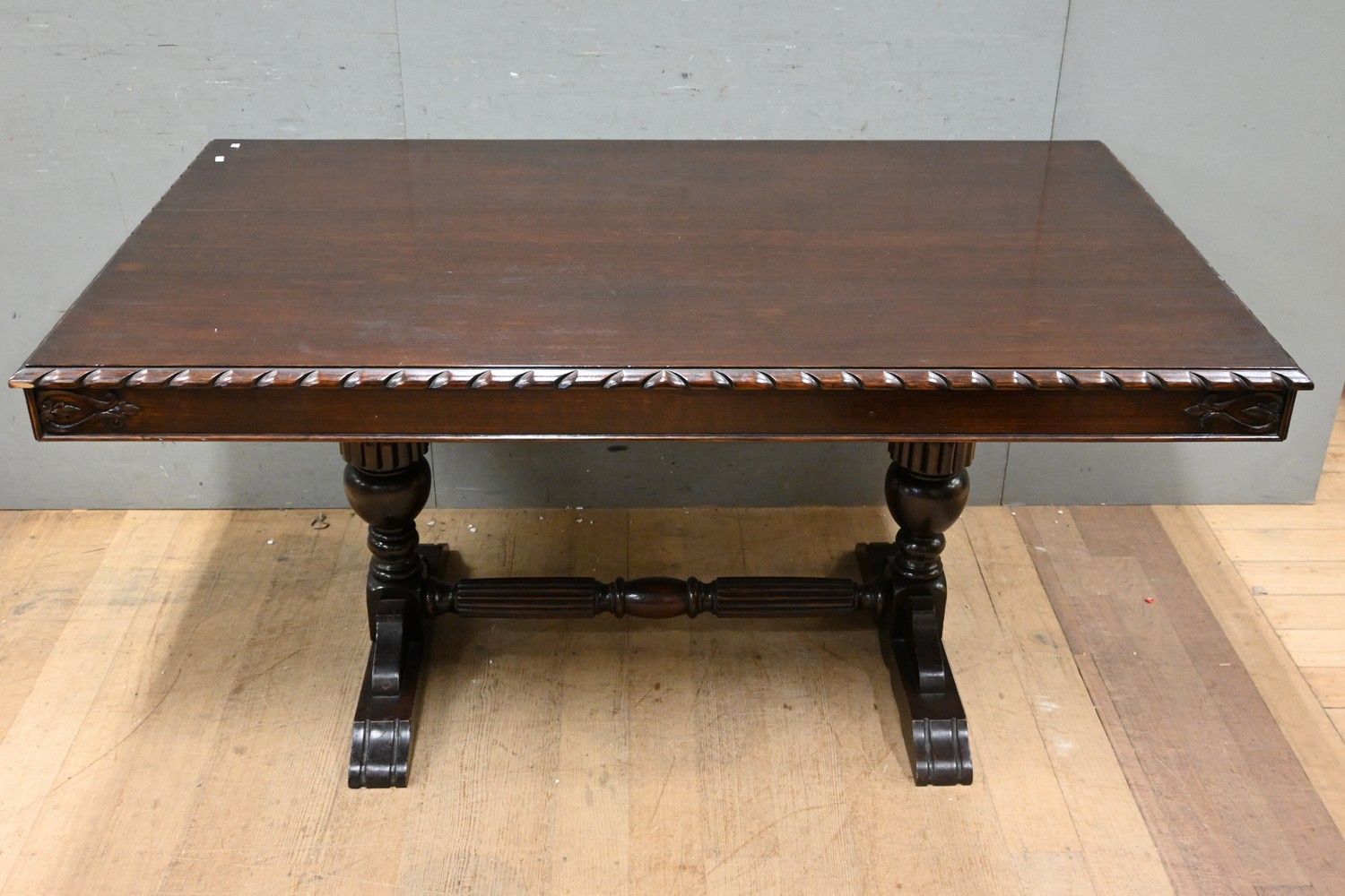 A JACOBEAN DINING TABLE ON STRETCHER BASE (75H x 154W x 92D CM) (PLEASE NOTE THIS HEAVY ITEM MUST BE REMOVED BY CARRIERS AT THE CUSTOMER'S EXPENSE. LEONARD JOEL STAFF CANNOT ASSIST CARRYING THIS ITEM) (X-LARGE ITEM)