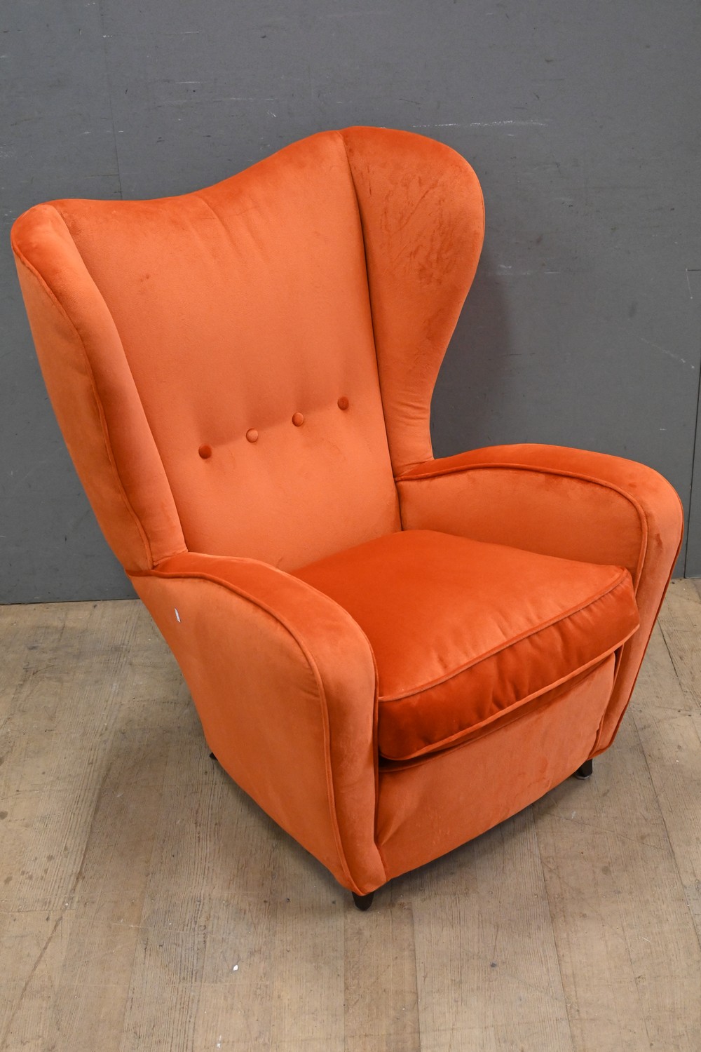 A VELVET ORANGE CLUB CHAIR, C 1950 (102H x 82W x 89D CM) (LEONARD JOEL DELIVERY SIZE: LARGE)