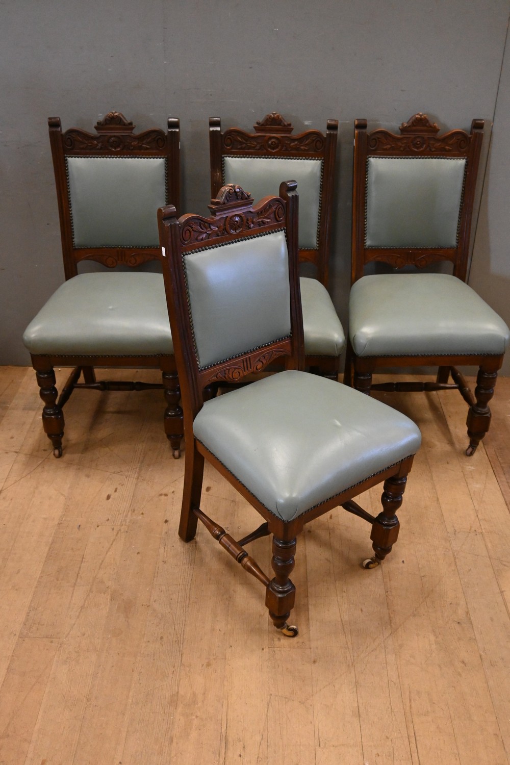 A SET OF FOUR EARLY 20TH CENTURY LEATHER COVERED DINING CHAIRS (A/F) (103H x 52W x 57D CM) (PLEASE NOTE THIS HEAVY ITEM MUST BE REMOVED BY CARRIERS AT THE CUSTOMER'S EXPENSE. LEONARD JOEL STAFF CANNOT ASSIST CARRYING THIS ITEM) (X-LARGE ITEM)