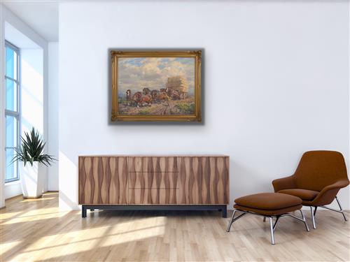 Beginning her studies underneath Harold Septimus Power, Cathleen Edkins is often described as one of Australia's most outstanding realist painters for her interpretation of cattle and draught horses. Edkins practiced the plein air technique, sometimes using multiple locations for her paintings. Once she had decided on a particular scene, she would travel the region and paint from different scenic components that were best suited.