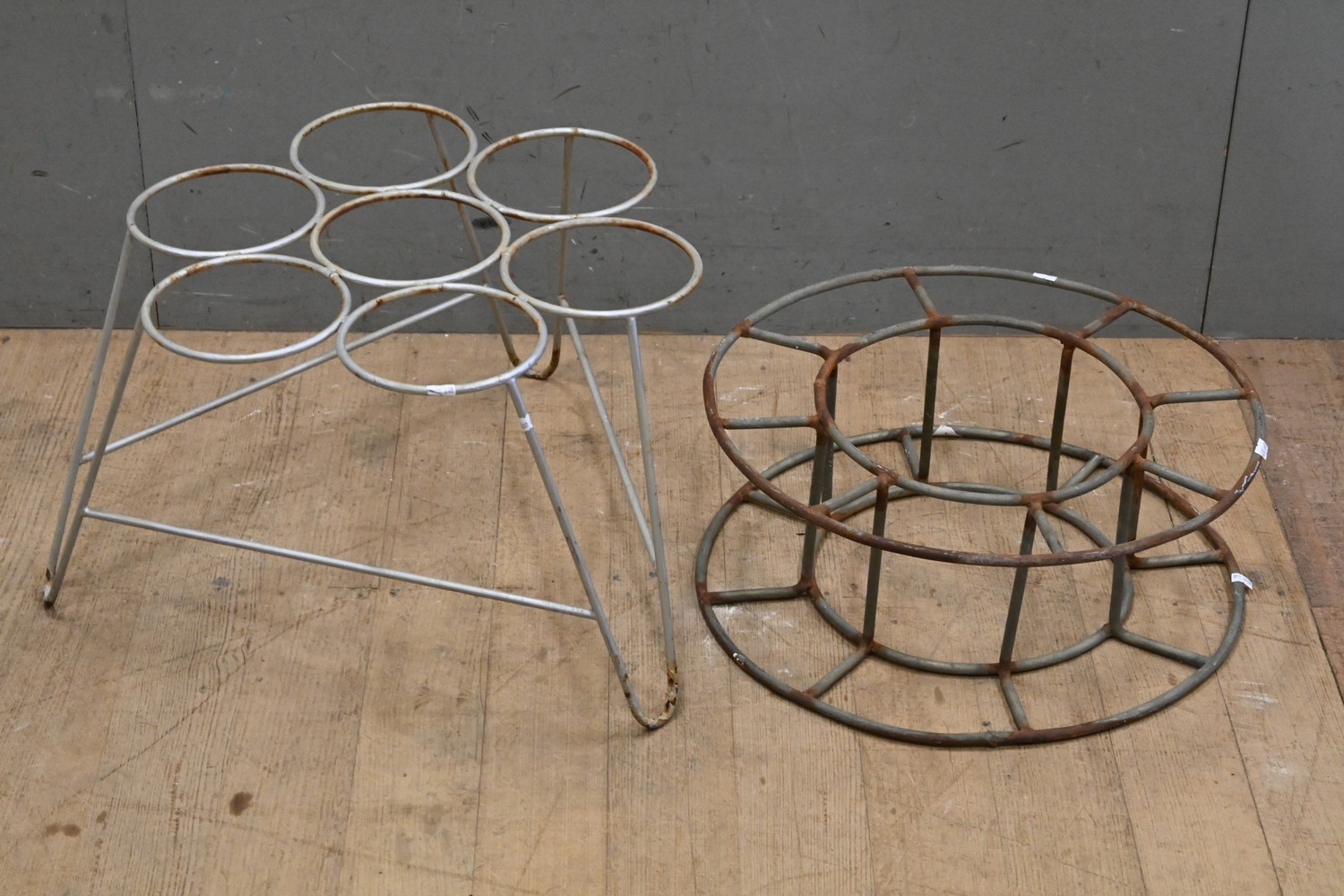 TWO PLANT STANDS - ONE POT HOLDER AND ONE CIRCULAR WHEEL FORM ( 35H X 58 DIAMETER CM) (LEONARD JOEL DELIVERY SIZE: MEDIUM)