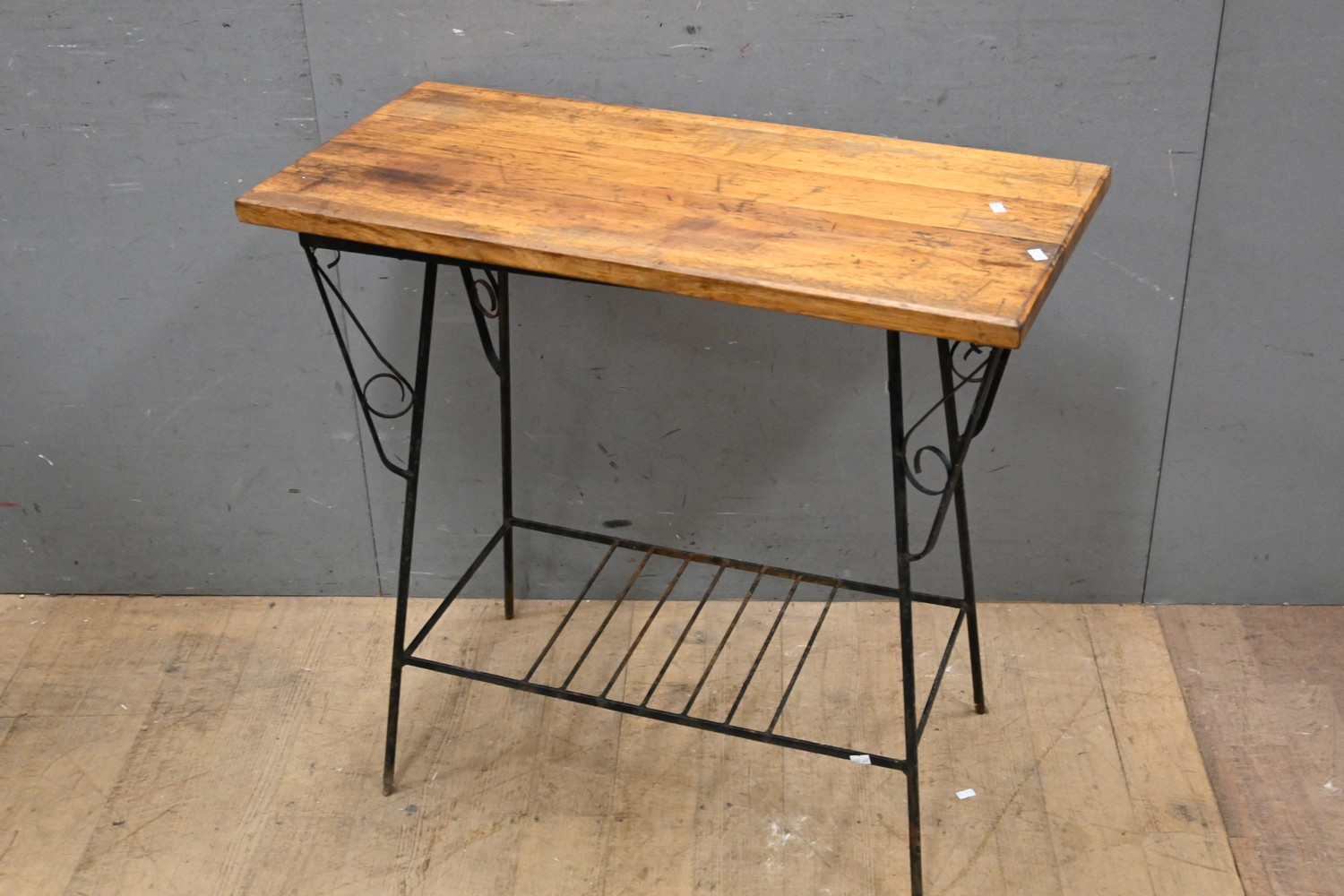 A RETRO MID CENTURY WROUGHT IRON BASED AND WOODEN TOPPED SIDE TABLE WITH LOWER RACK ( 80H X 86W X 40D CM) (LEONARD JOEL DELIVERY SIZE: LARGE)