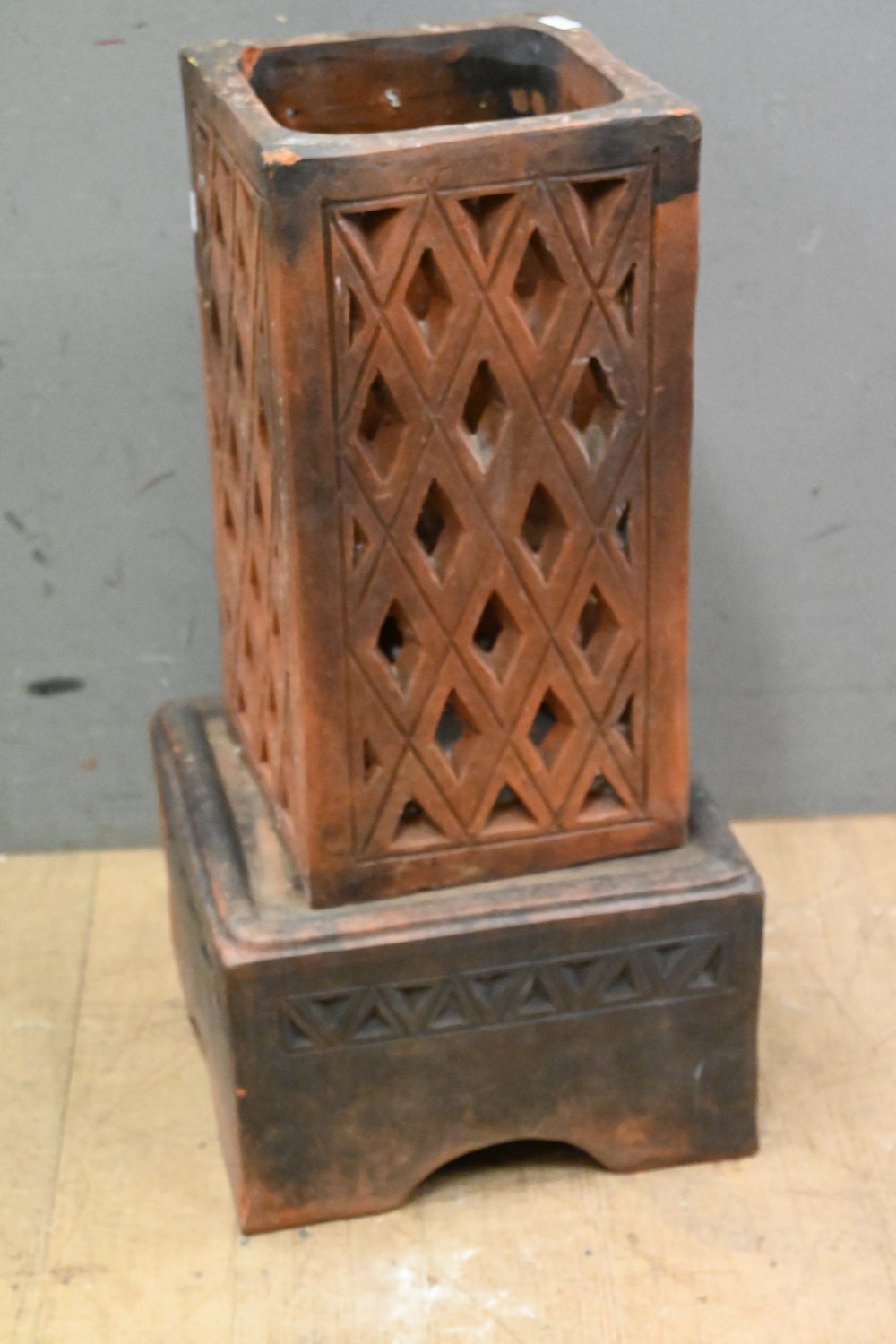 AN AUSTRALIAN TERACOTTA TWO SECTION PIERCED OUTDOOR CANDLE LAMP ( 62H X 31W X 31D CM) (LEONARD JOEL DELIVERY SIZE: LARGE)
