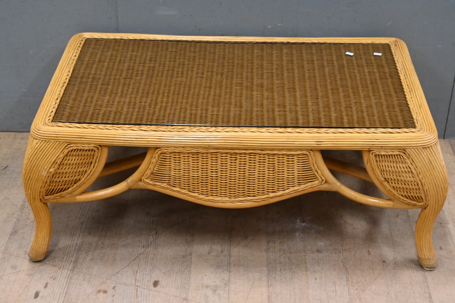 AN AUSTRALIAN SIGNED GLASS TOPPED CANE RECTANGULAR FORM COFFEE TABLE ( 40H X 110W X 65D CM) (LEONARD JOEL DELIVERY SIZE: LARGE)