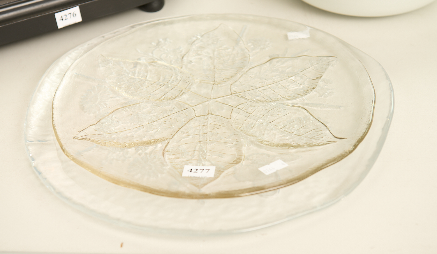 A KOSTA BODA ART GLASS LEAF PLATTER TOGETHER WITH FLORAL PLATTER BY KJELL ENGMAN DIA.33CM (LARGEST), LEONARD JOEL LOCAL DELIVERY SIZE: MEDIUM