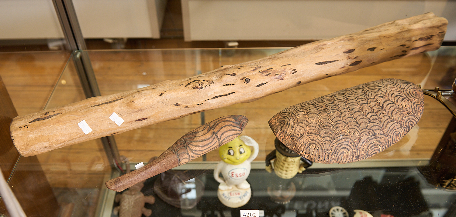AN ABORIGINAL COOLAMON WITH NATURAL PIGMENT REMNANTS TOGETHER WITH SMALL HAND CLUB AND UNDECORATED DIDGERIDOO L.83CM, LEONARD JOEL LOCAL DELIVERY SIZE: MEDIUM
