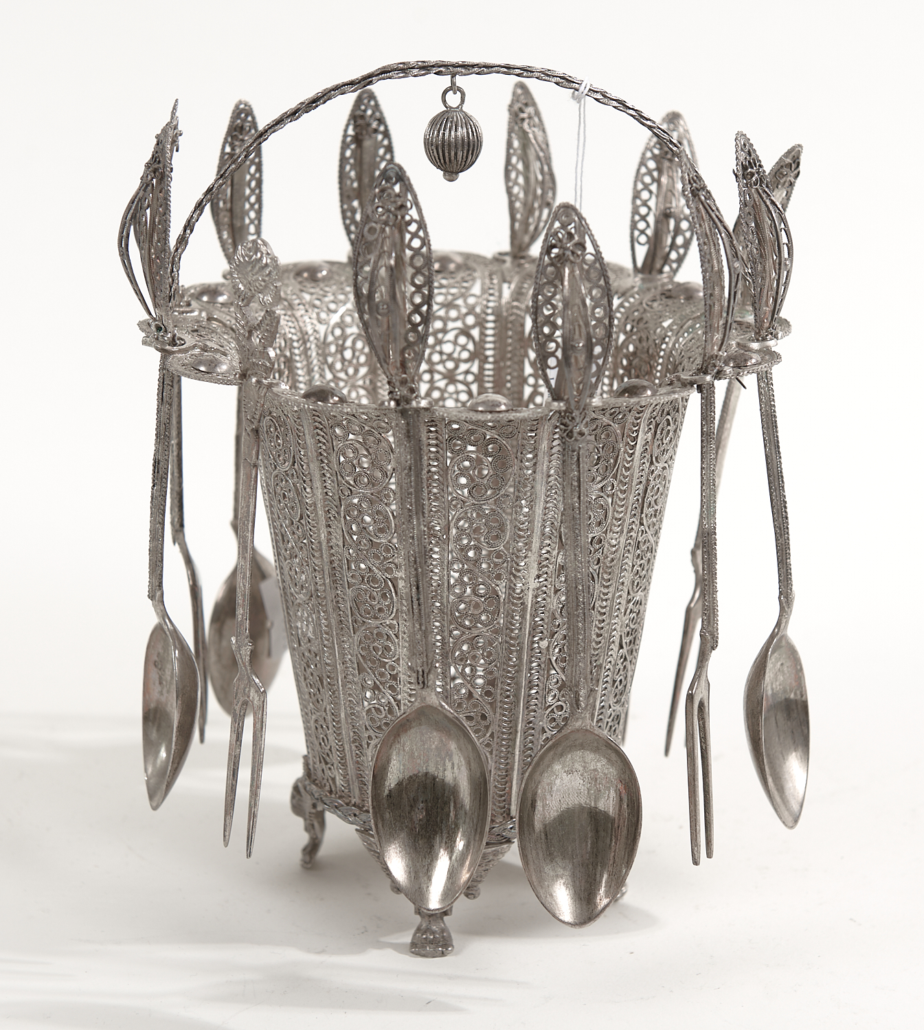 AN 800 SILVER FILIGREE BASKET WITH MATCHED SPOONS AND FORKS H.19.5CM, LEONARD JOEL LOCAL DELIVERY SIZE: SMALL