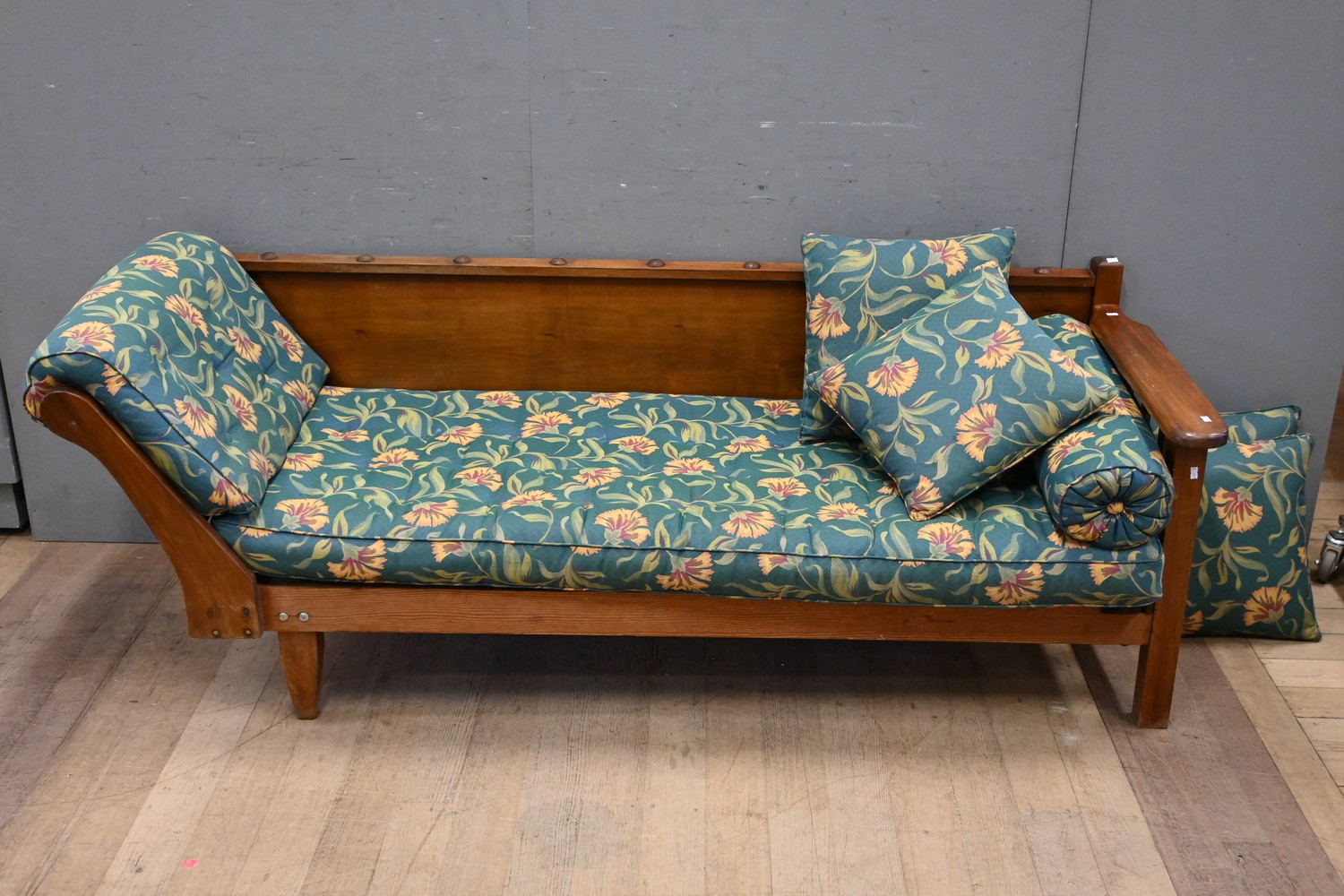 AN EARLY 20TH CENTURY CEDAR AND PINE MINER'S COUCH WITH UPHOLSTERED CUSHIONS (A/F) (72H x 203W x 73D CM) (PLEASE NOTE THIS HEAVY ITEM MUST BE REMOVED BY CARRIERS AT THE CUSTOMER'S EXPENSE. LEONARD JOEL STAFF CANNOT ASSIST CARRYING THIS ITEM) (X-LARGE ITEM)