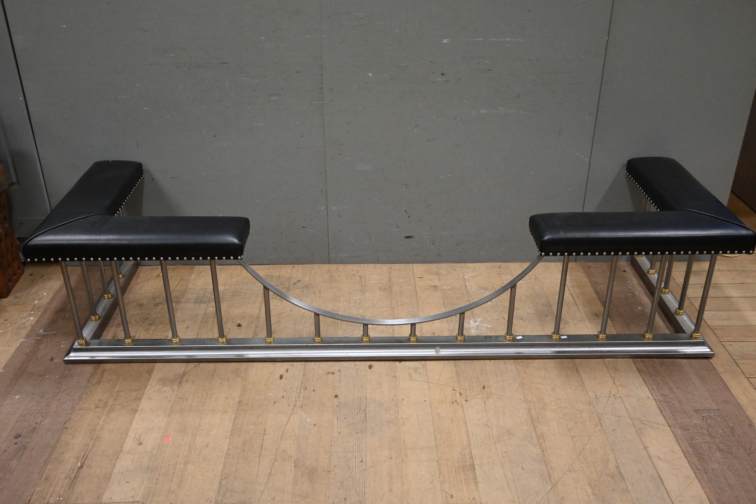 A LARGE CONTEMPORARY STEEL FIRE SURROUND WITH PADDED LEATHER CORNERS (51H x 238W x 72D CM) (PLEASE NOTE THIS HEAVY ITEM MUST BE REMOVED BY CARRIERS AT THE CUSTOMER'S EXPENSE. LEONARD JOEL STAFF CANNOT ASSIST CARRYING THIS ITEM) (X-LARGE ITEM)