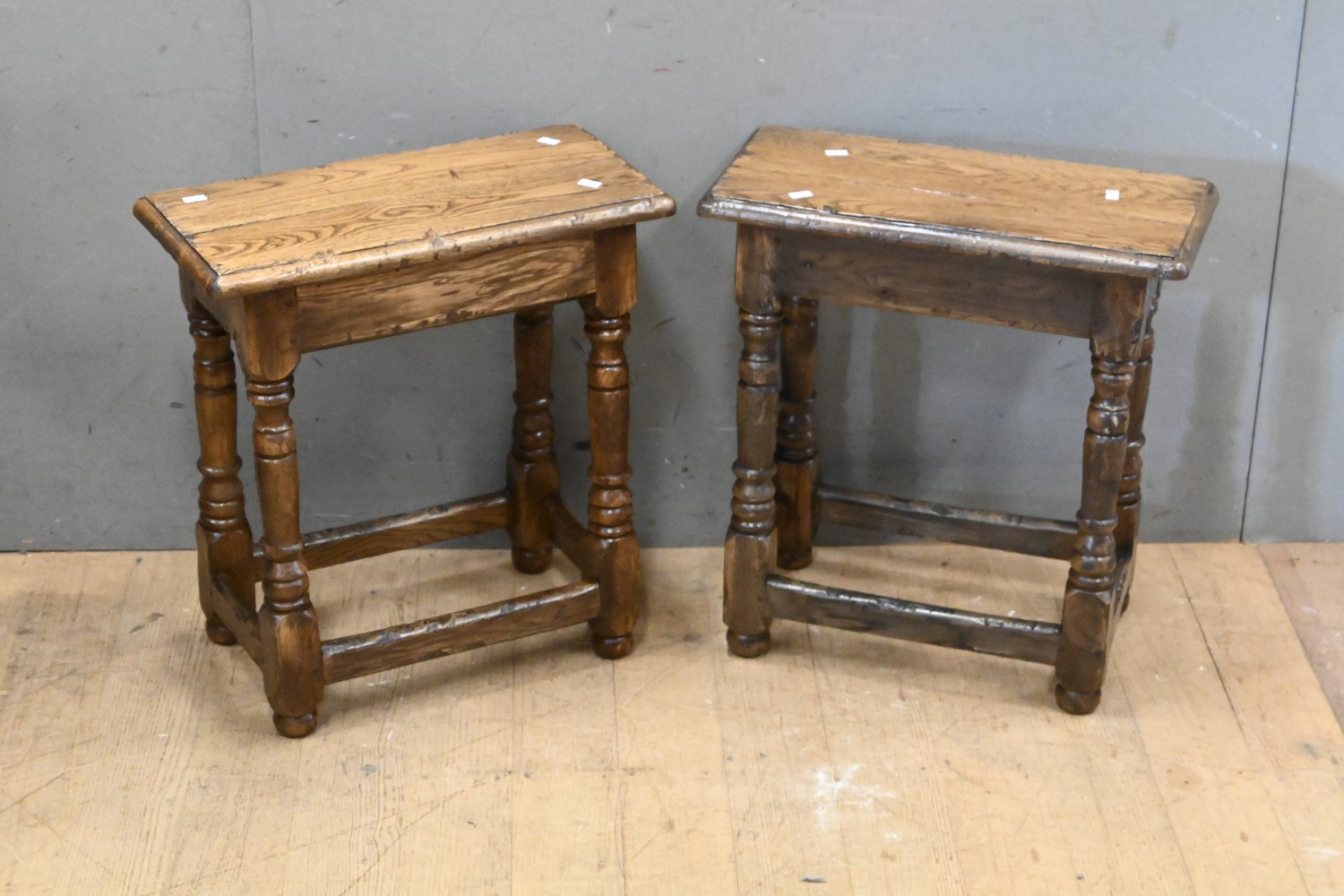 A PAIR OF CHARLES II STYLE OAK JOINT STOOLS (52H x 49W x 25D CM) (LEONARD JOEL DELIVERY SIZE: LARGE)