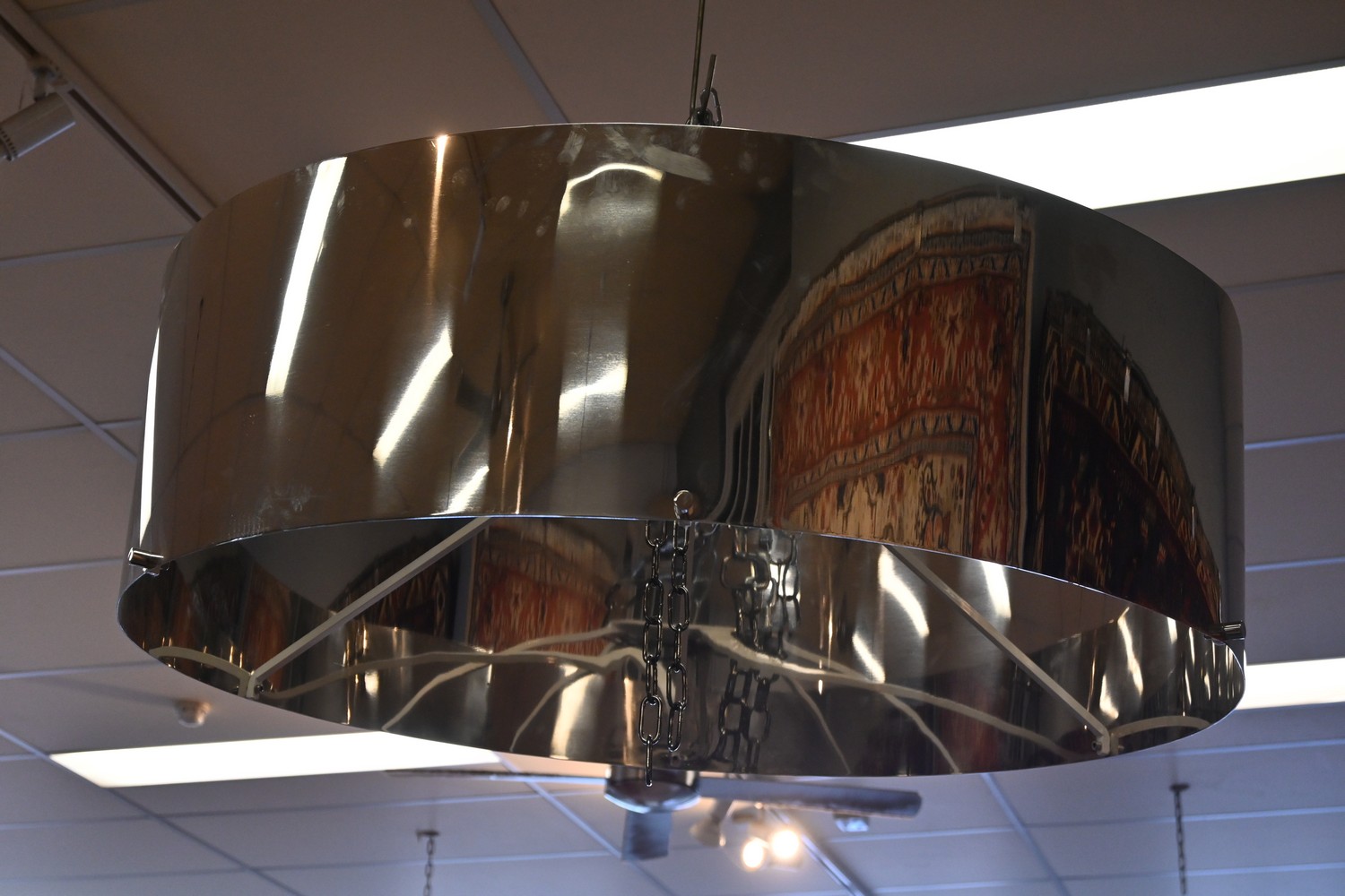 A LARGE NICKEL OVERHEAD PENDANT (One Metre Diameter)(PLEASE NOTE THIS HEAVY ITEM MUST BE REMOVED BY CARRIERS AT THE CUSTOMER'S EXPENSE. LEONARD JOEL STAFF CANNOT ASSIST CARRYING THIS ITEM) (X-LARGE ITEM)