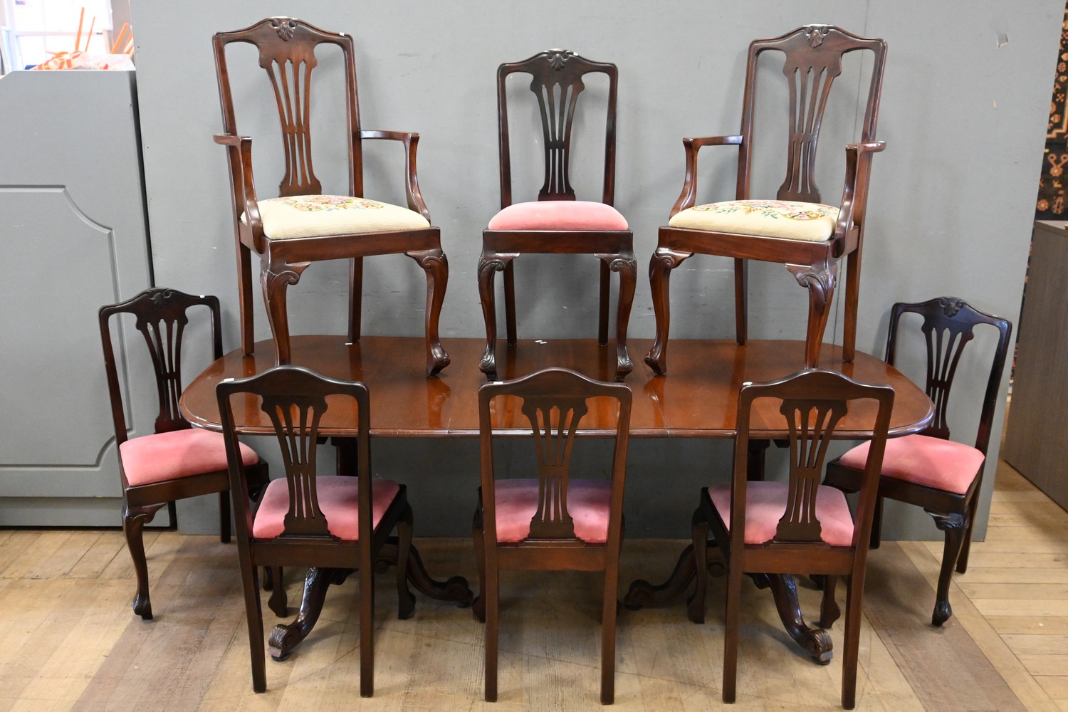A MAHOGANY NINE PIECE DINING SETTING (A/F) (76H x 201W x 93D CM) (PLEASE NOTE THIS HEAVY ITEM MUST BE REMOVED BY CARRIERS AT THE CUSTOMER'S EXPENSE. LEONARD JOEL STAFF CANNOT ASSIST CARRYING THIS ITEM) (X-LARGE ITEM)
