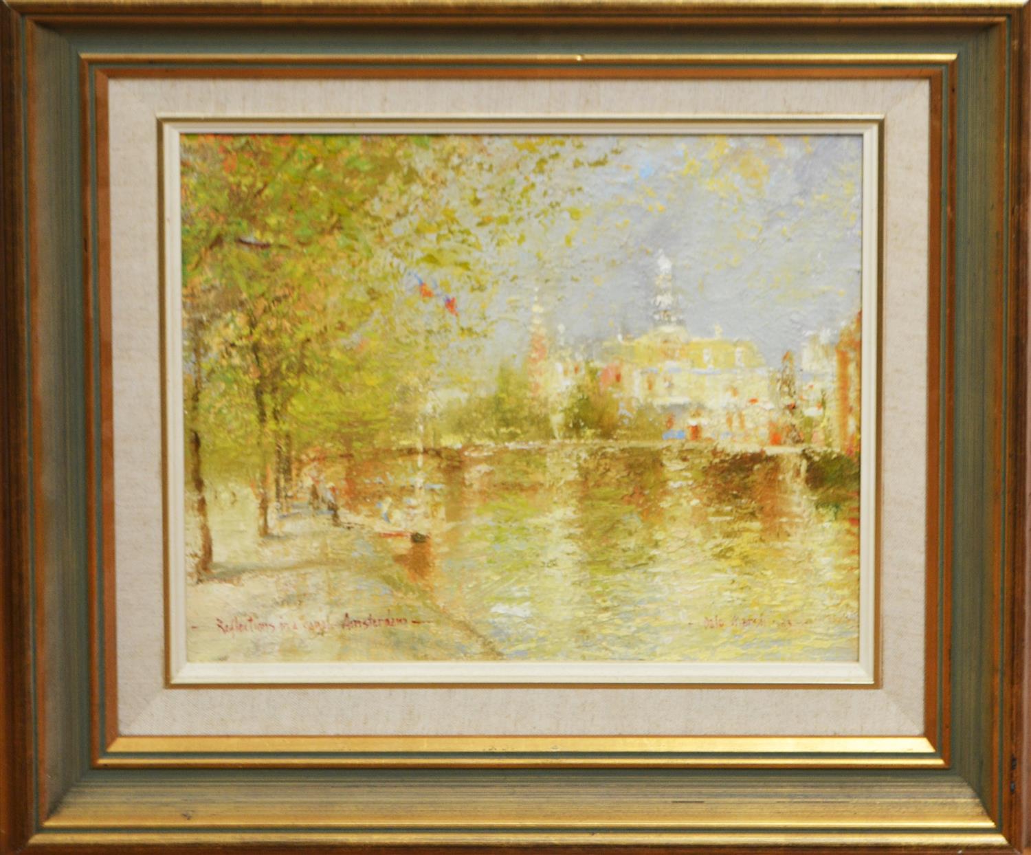 DALE MARSH, REFLECTIONS IN A CANAL, AMSTERDAM 1983, OIL ON BOARD, 29 X 36CM