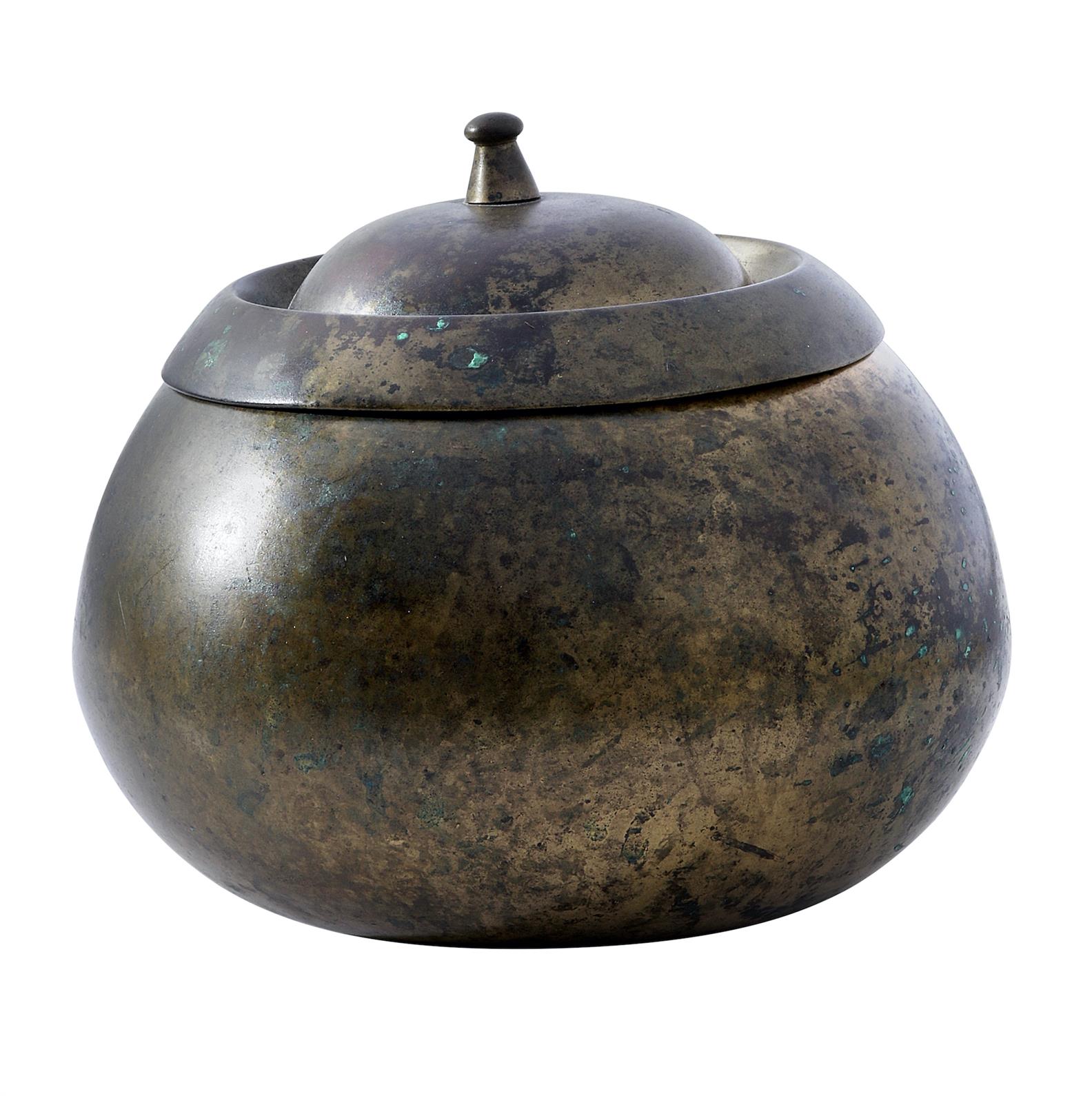 Adorned simply with an incised horizontal line around the rim, the patina with some verdigris.