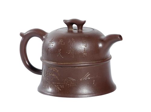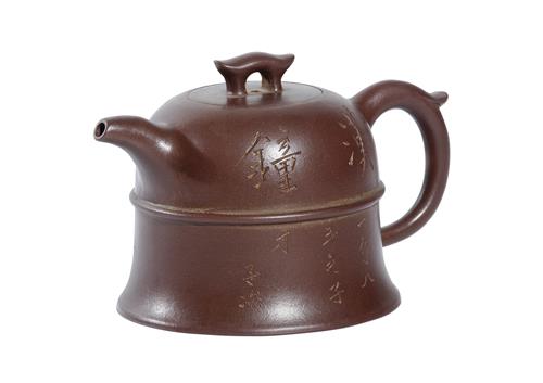 Of archaic bell form in deep purplish-brown clay, with incised calligraphy and landscape decoration to each side, marked to the base.