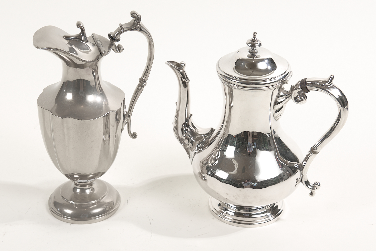 A SILVER PLATED CLARET JUG AND TEA POT, LEONARD JOEL LOCAL DELIVERY SIZE: MEDIUM