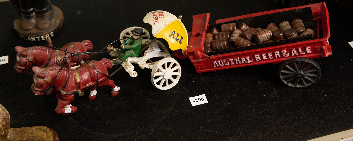 A VINTAGE CAST IRON AUSTRAL BEER & ALE HORSE AND CART WITH WOODEN BEER KEGS L.44CM, LEONARD JOEL LOCAL DELIVERY SIZE: SMALL