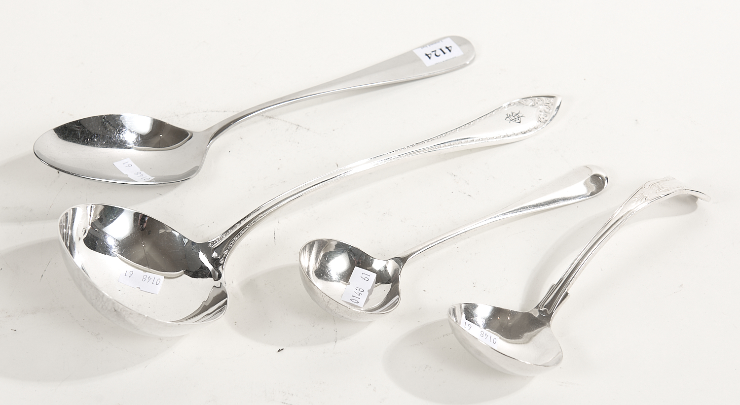 A GROUP OF FOUR VICTORIAN SILVERPLATED SERVING LADLES INCLUDING SOUP LADLE, LEONARD JOEL LOCAL DELIVERY SIZE: SMALL