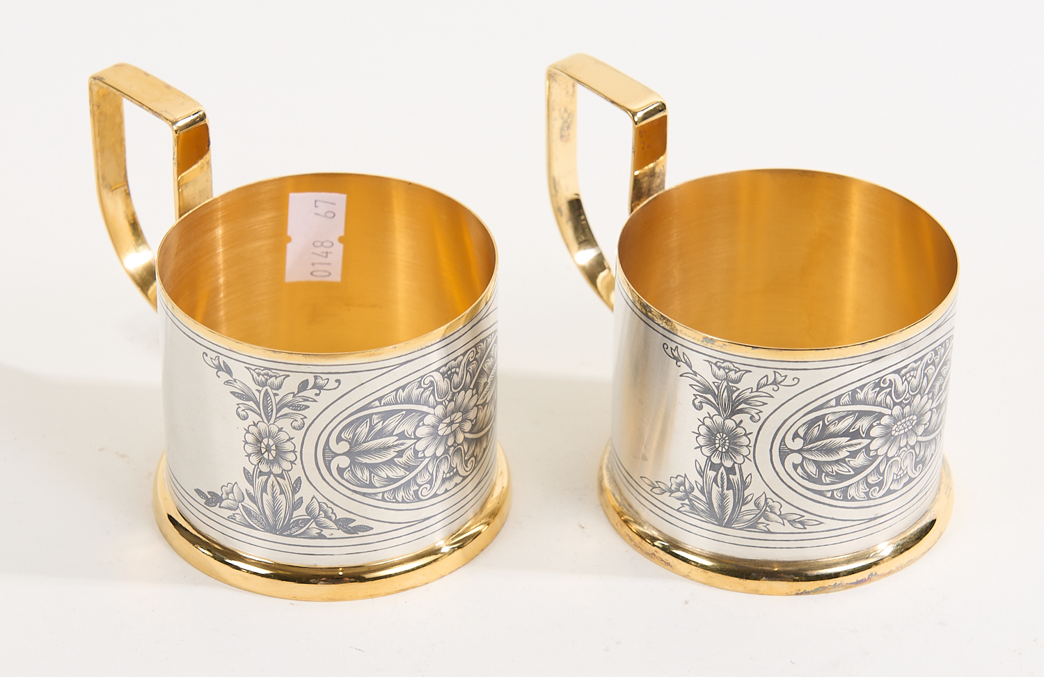 A PAIR OF RUSSIAN SILVER GILDED AND NIELLO CUP HOLDERS - 206 GRAMS, LEONARD JOEL LOCAL DELIVERY SIZE: SMALL