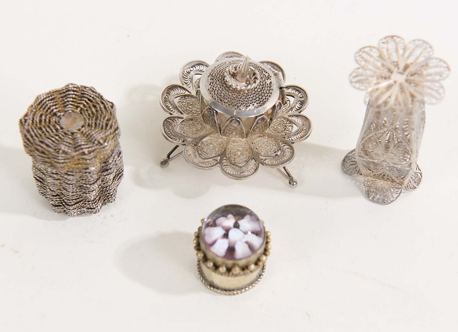 COLLECTION OF FOUR SILVER FILIGREE VASES AND LIDDED POTS - 80 GRAMS H.5.5CM, LEONARD JOEL LOCAL DELIVERY SIZE: SMALL