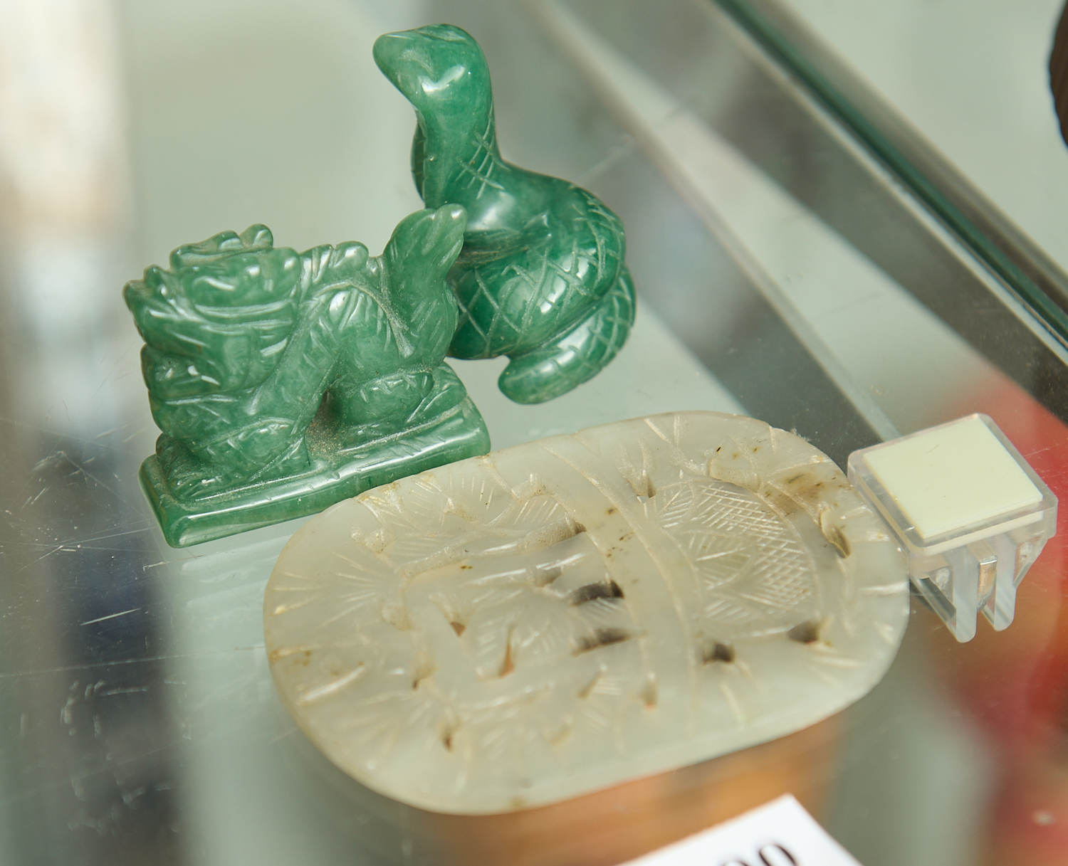 A COLLECTION OF HARDSTONE FIGURES AND A PIERCED DISC W.7CM (LARGEST), LEONARD JOEL LOCAL DELIVERY SIZE: SMALL