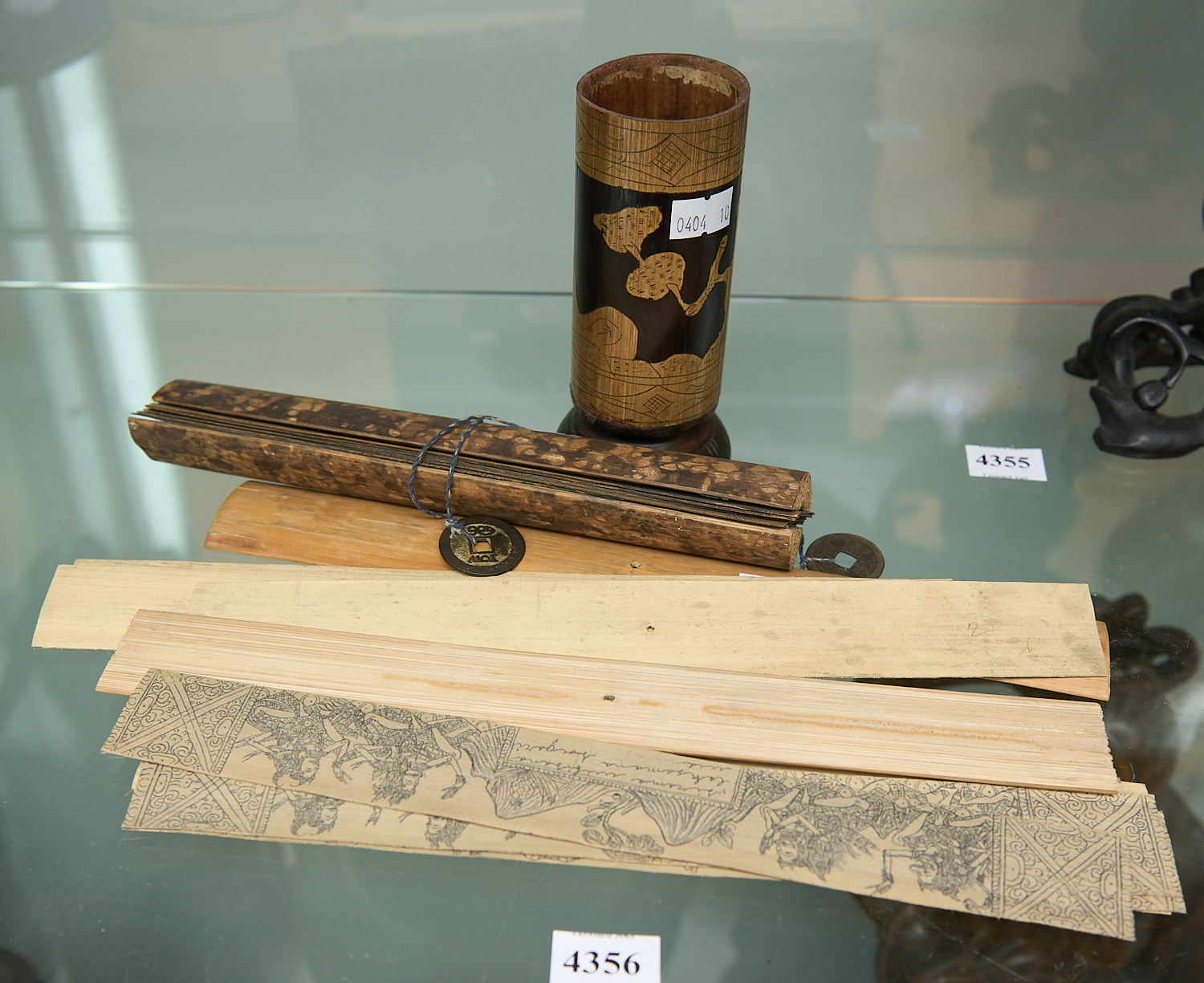 TWO BALINESE RELIGIOUS SUTRAS TOGETHER WITH A BAMBOO VASE W.26CM, LEONARD JOEL LOCAL DELIVERY SIZE: SMALL