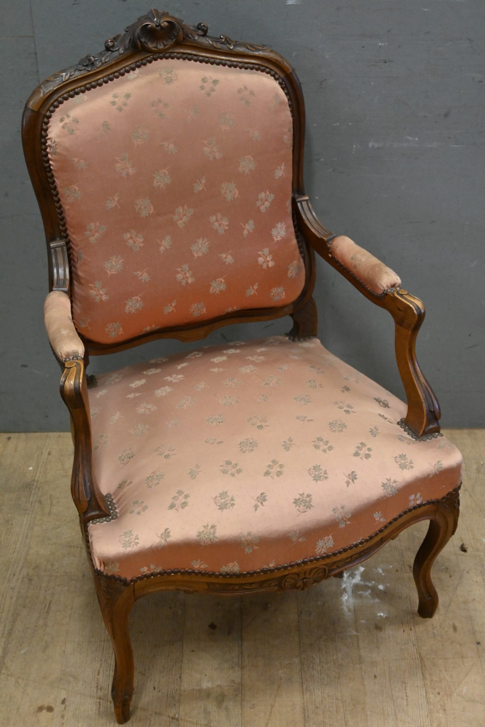 A 19TH CENTURY LOUIS PHILLIPE FAUTEUIL, c.1850's (A/F) (H101 X W67 X D66 CM) (LEONARD JOEL DELIVERY SIZE: LARGE)