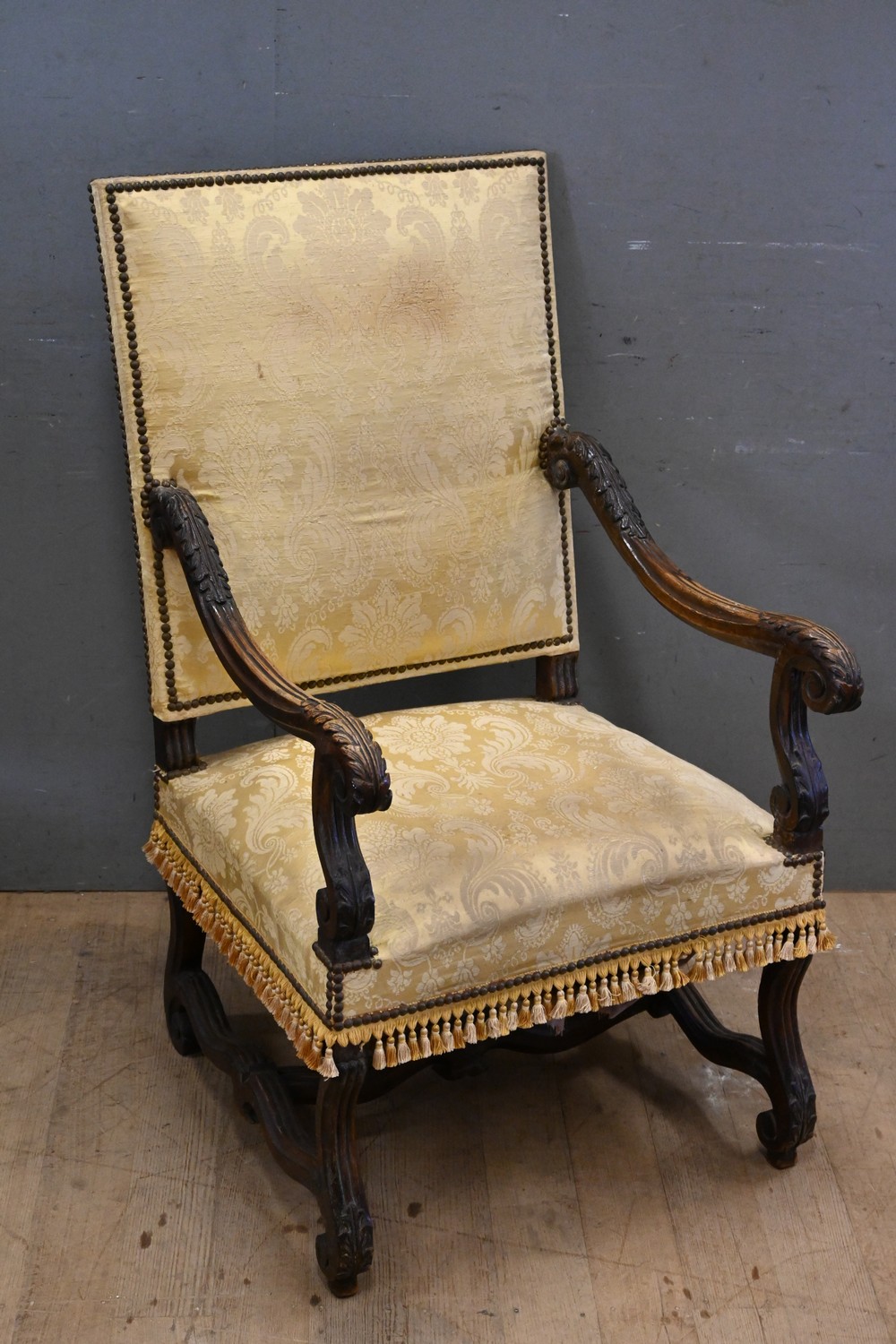 AN 18TH CENTURY FRENCH LOUIS XIV FAUTEUIL, c.1780's (A/F) (111H x 64W x 71D CM) (LEONARD JOEL DELIVERY SIZE: LARGE)