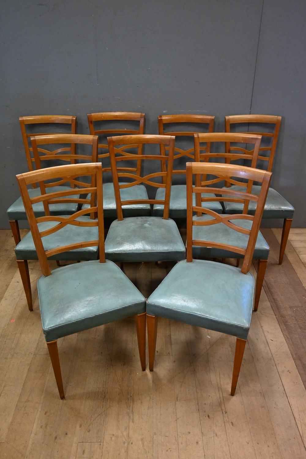A SET OF NINE FRENCH ART DECO DINING CHAIRS BY JULES LELEU, c.1940's (A/F) (H97 X W41 X D51 CM) (PLEASE NOTE THIS HEAVY ITEM MUST BE REMOVED BY CARRIERS AT THE CUSTOMER'S EXPENSE. LEONARD JOEL STAFF CANNOT ASSIST CARRYING THIS ITEM) (X-LARGE ITEM)