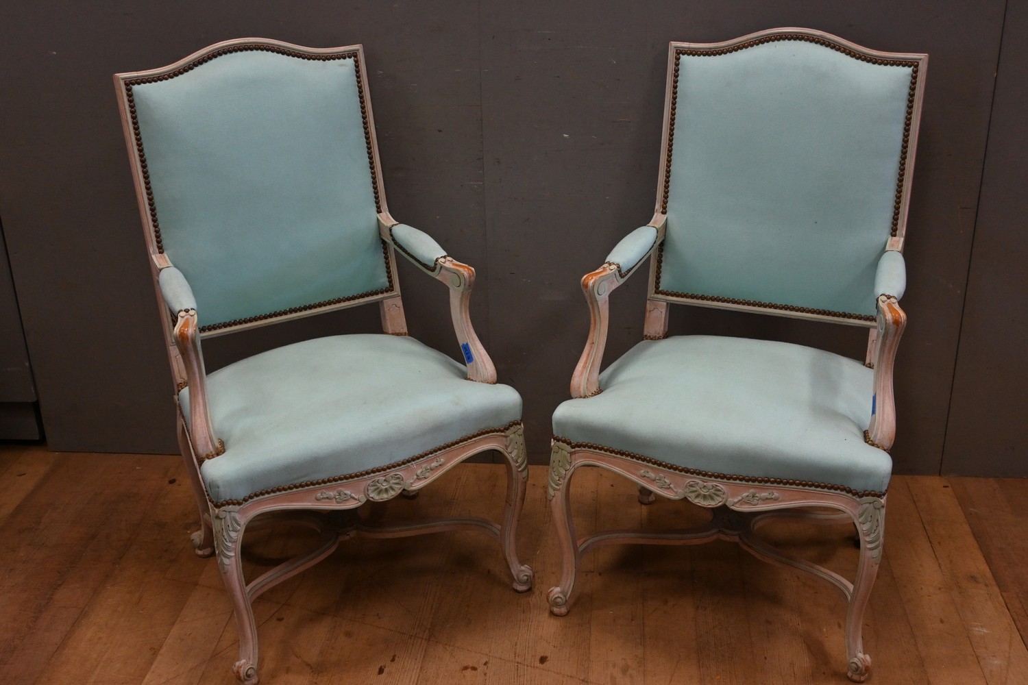 A PAIR OF FRENCH LOUIS XIV FAUTEUILS, C 1940'S (A/F) (H110 X W64 X D64 CM) (LEONARD JOEL DELIVERY SIZE: LARGE)