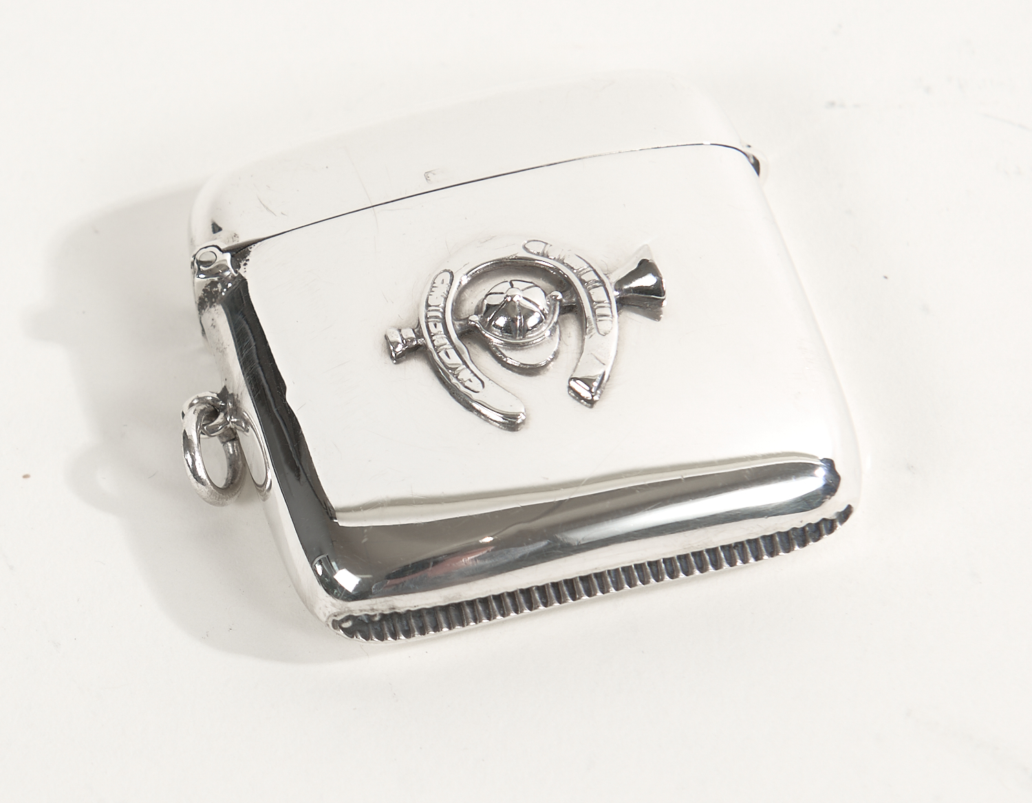 A LARGE STERLING SILVER ANTIQUE VESTA CASE, BIRMINGHAM 1919, EQUESTRIAN THEME WITH APPLIED HORSESHOE, BUGAL AND CUP H.5.5CM, LEONARD JOEL LOCAL DELIVERY SIZE: SMALL