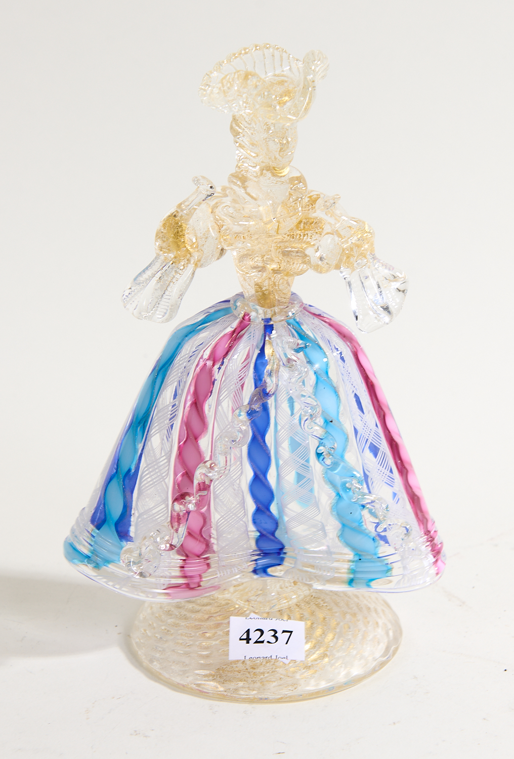A 1950'S MURANO LATTICINO BAMBINI GLASS LADY FIGURINE WITH GOLD FLECKS H.20.5CM, LEONARD JOEL LOCAL DELIVERY SIZE: SMALL