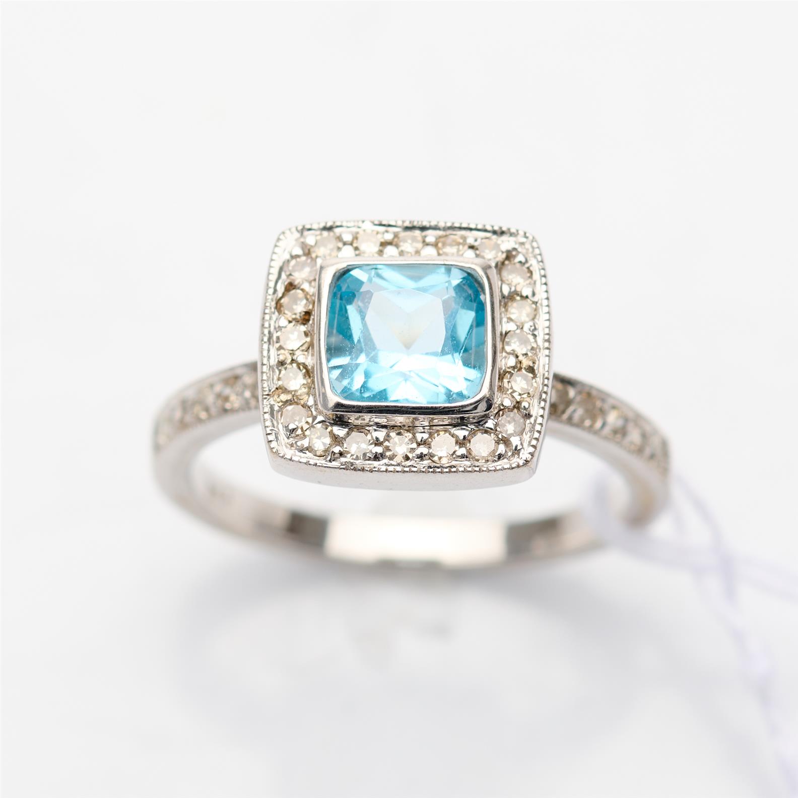 A BLUE TOPAZ & DIAMOND SET RING IN 9CT WHITE GOLD, SIZE M 1/2, 3.25GMS