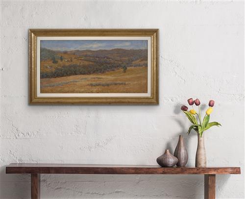 There are five areas of repair verso. Otherwise, the work is in overall good condition. There is a minor indentation on the upper edge from the stretcher bar. Housed in a modern frame. 97.5 x 56.5 (framed).