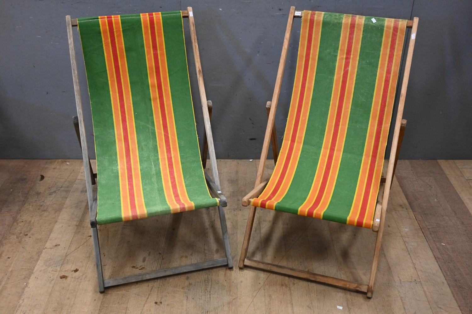 A PAIR OF VINTAGE CANVAS SUN CHAIRS (A/F) ( 90H X 60W X 94D CM) (LEONARD JOEL DELIVERY SIZE: MEDIUM)