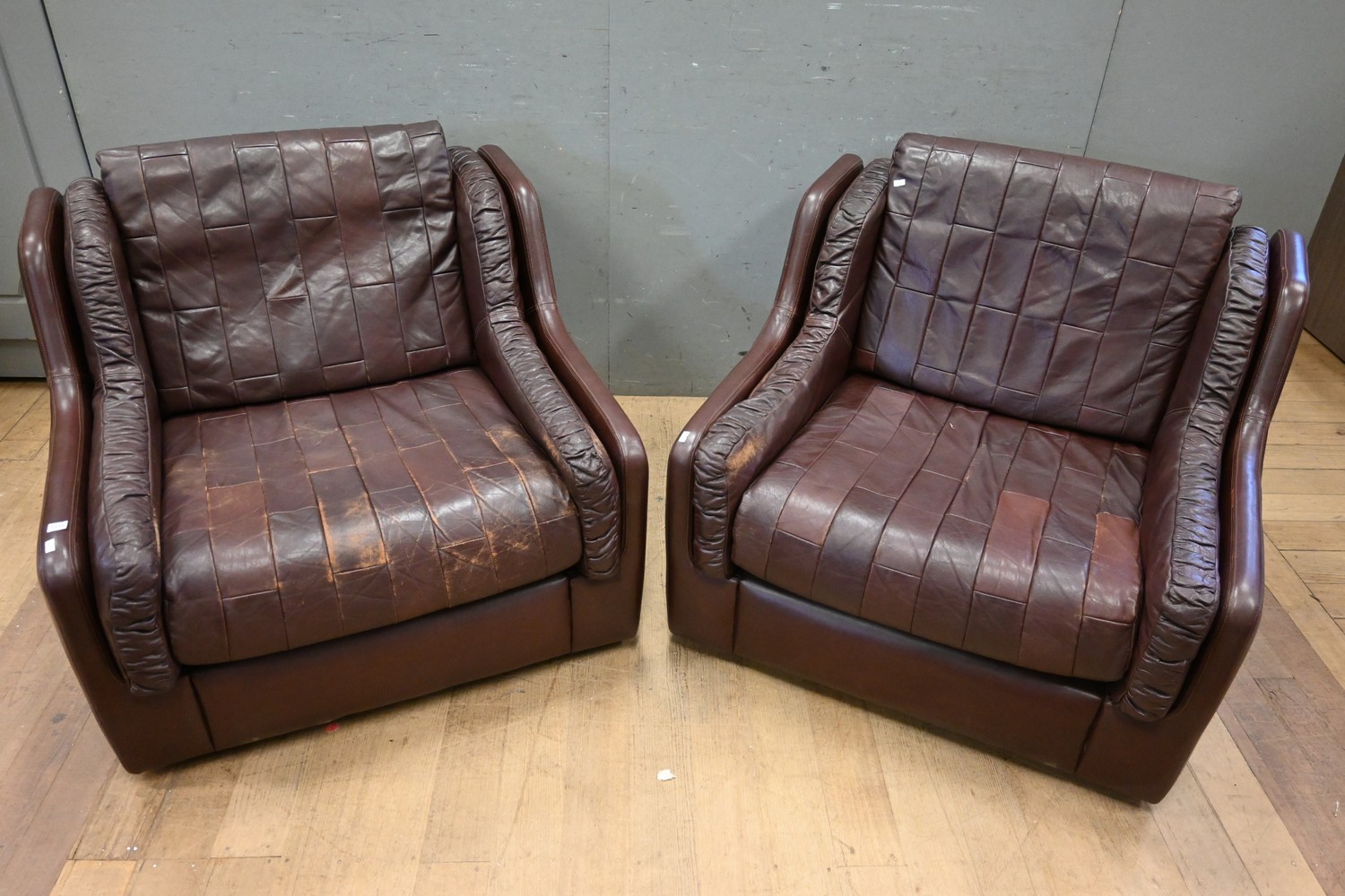 A PAIR OF VINTAGE 'MODULE' LOW LINE LEATHER PATCHWORK ARMCHAIRS (A/F) (87H x 94W x 87D CM) (PLEASE NOTE THIS HEAVY ITEM MUST BE REMOVED BY CARRIERS AT THE CUSTOMER'S EXPENSE. LEONARD JOEL STAFF CANNOT ASSIST CARRYING THIS ITEM) (X-LARGE ITEM)