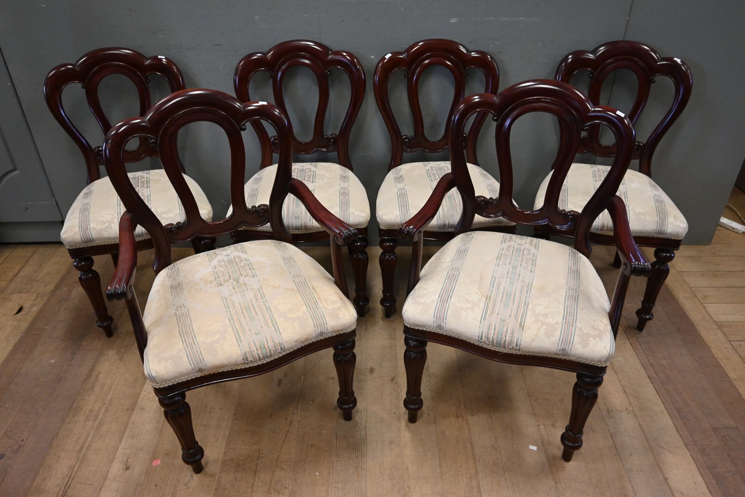 A SET OF SIX VICTORIAN STYLE DINING CHAIRS INCLUDING TWO CARVERS (94H x 64W x 57D CM) (LEONARD JOEL DELIVERY SIZE: LARGE)