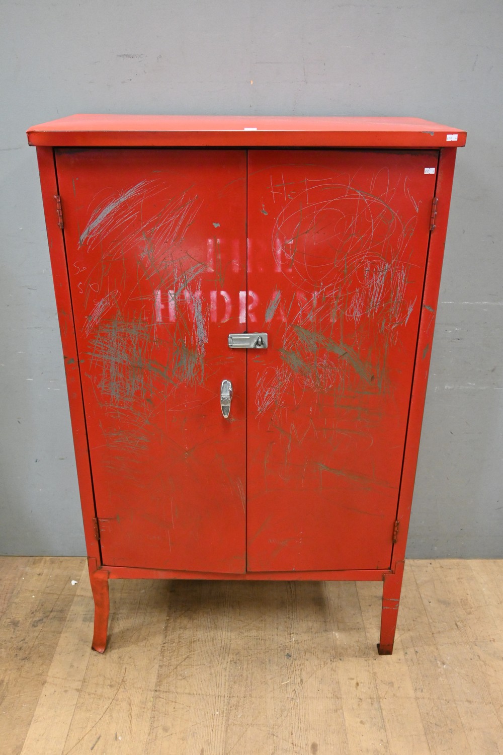A RED PAINTED METAL FIRE EXTINGUISHER CABINET (A/F) (151H x 90W x 45D CM) (PLEASE NOTE THIS HEAVY ITEM MUST BE REMOVED BY CARRIERS AT THE CUSTOMER'S EXPENSE. LEONARD JOEL STAFF CANNOT ASSIST CARRYING THIS ITEM) (X-LARGE ITEM)