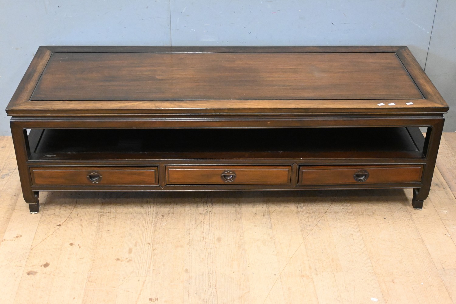 A CHINESE THREE DRAWER LOW COFFEE TABLE (A/F) (H45 X W153 X D55 CM) (PLEASE NOTE THIS HEAVY ITEM MUST BE REMOVED BY CARRIERS AT THE CUSTOMER'S EXPENSE. LEONARD JOEL STAFF CANNOT ASSIST CARRYING THIS ITEM) (X-LARGE ITEM)