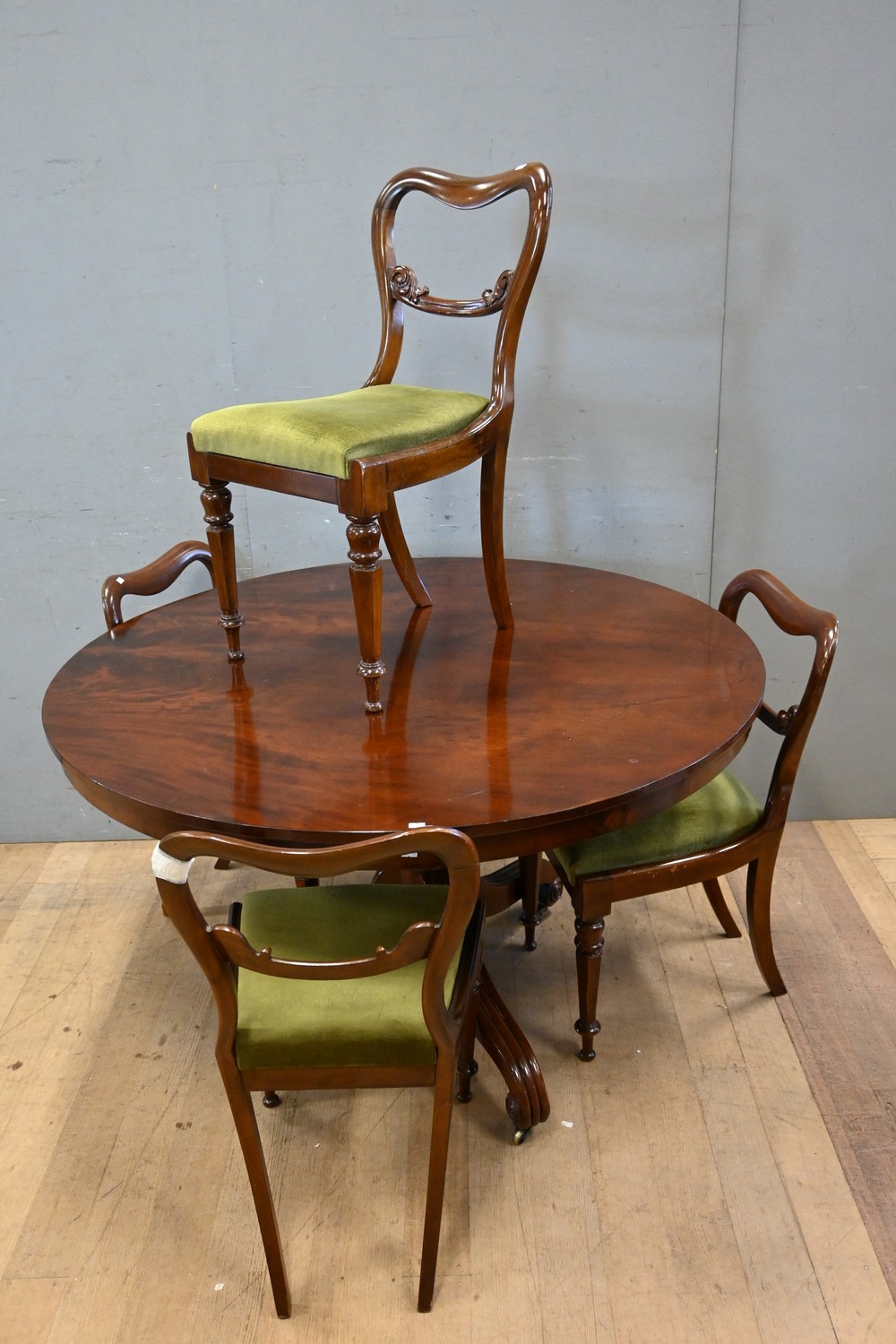 A VICTORIAN MAHOGANY CIRCULAR CENTRE TABLE AND FOUR MAHOGANY SADDLEBACK SALON CHAIRS (ONE CHAIR A/F) (H78 X W129 CM) (PLEASE NOTE THIS HEAVY ITEM MUST BE REMOVED BY CARRIERS AT THE CUSTOMER'S EXPENSE. LEONARD JOEL STAFF CANNOT ASSIST CARRYING THIS ITEM) (X-LARGE ITEM)