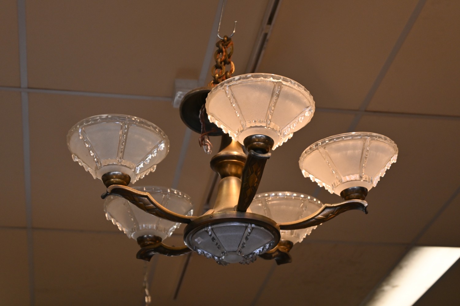 A FRENCH ART DECO BRONZE AND FROSTED GLASS FIVE BRANCH CHANDELIER, CIRCA 1930S (40H x 55D CM) (LEONARD JOEL DELIVERY SIZE: LARGE)