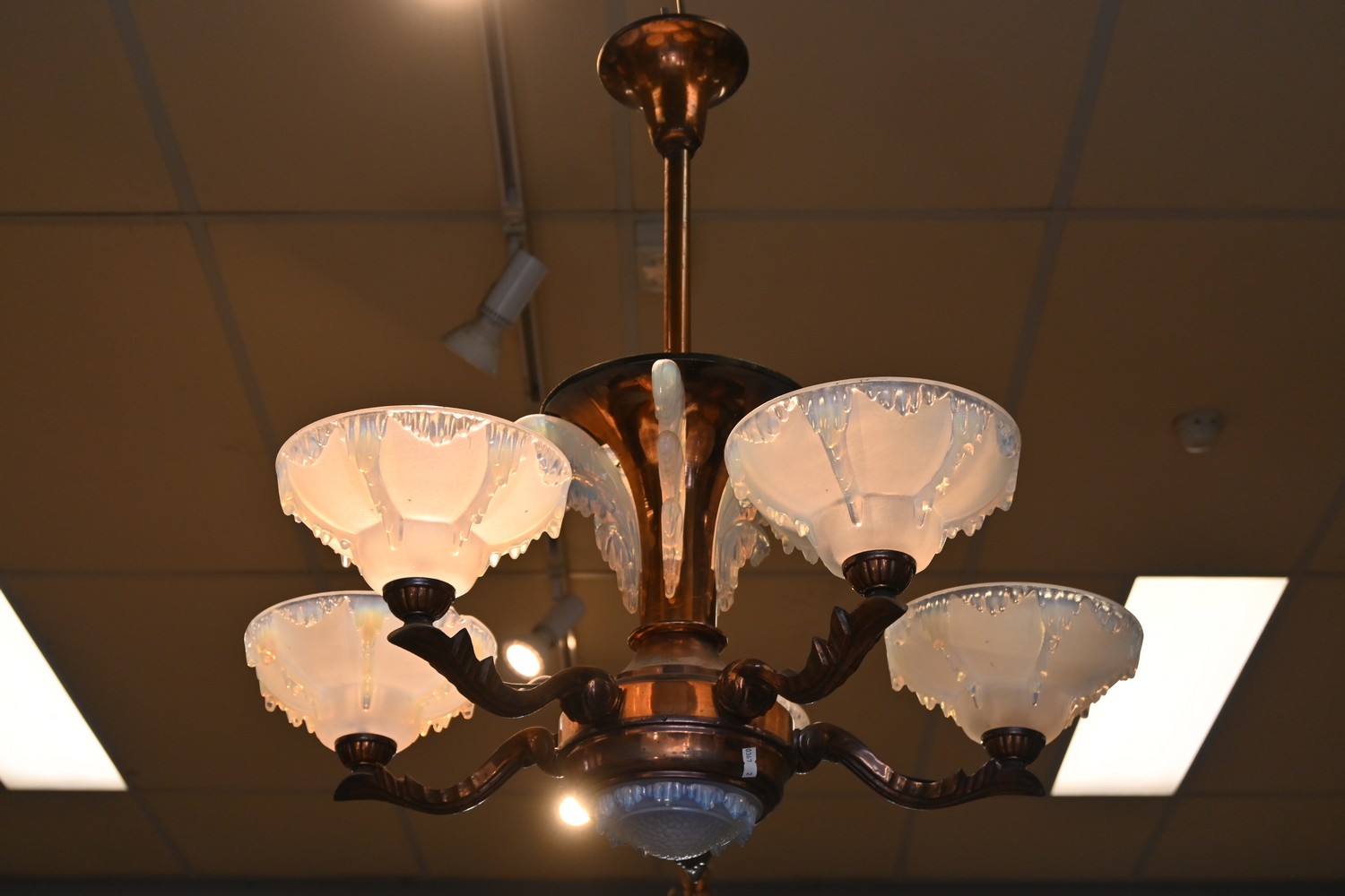 AN HENRI PETITOT DESIGN OPALESCENT GLASS AND BRASS FIVE BRANCH CHANDELIER, CIRCA 1935 (75H x 70D CM) (LEONARD JOEL DELIVERY SIZE: LARGE)